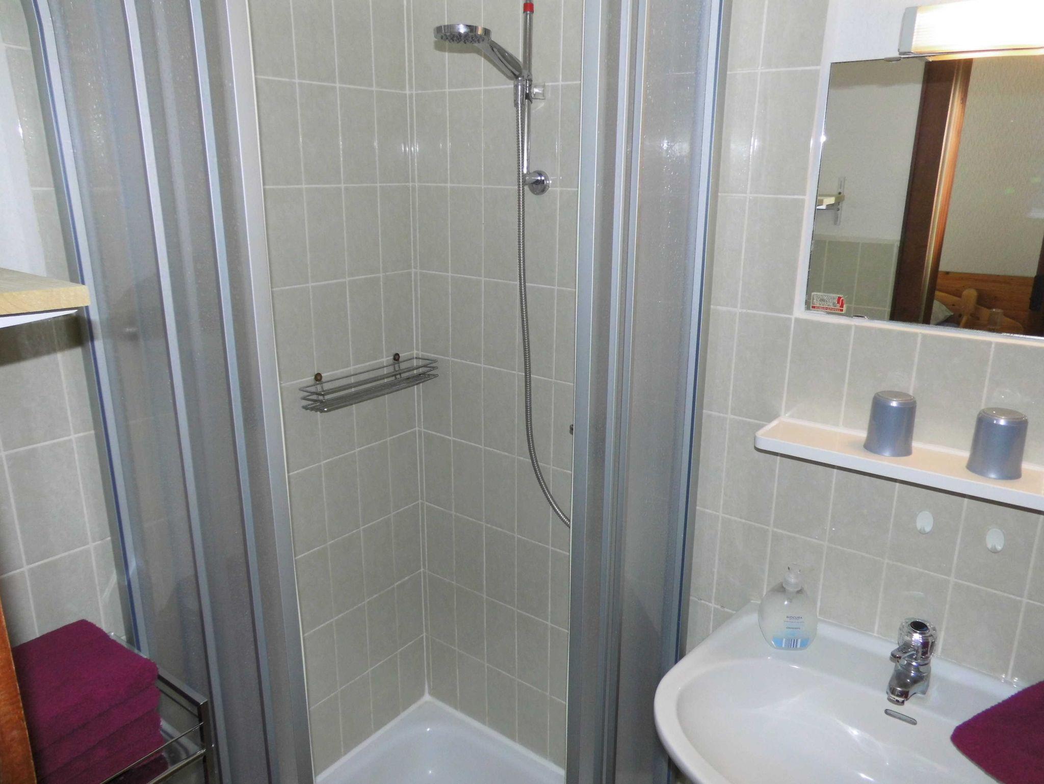 • Badezimmer mit Dusche, WC, Waschbecken.