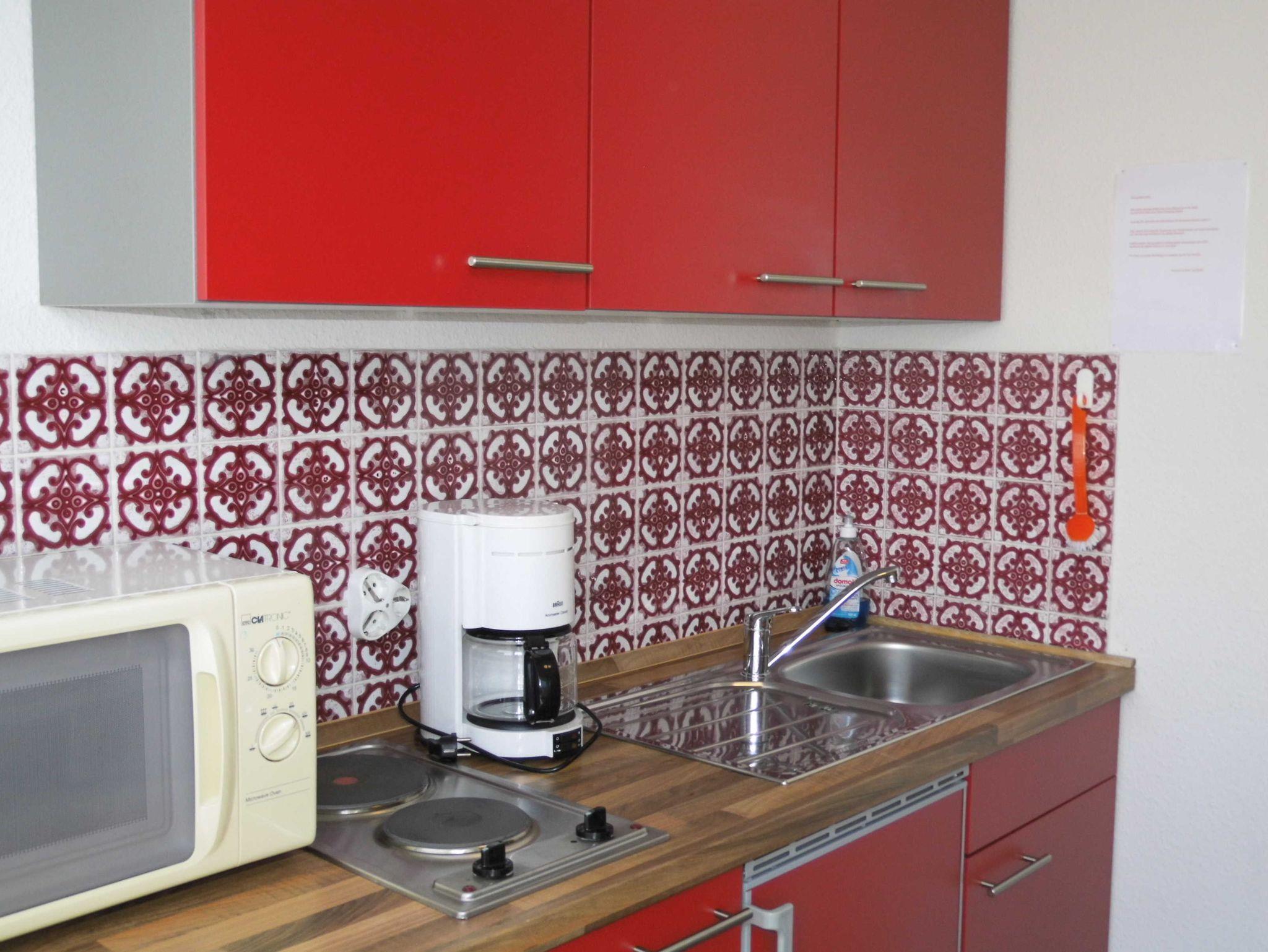 • separate Küche mit Kühlschrank, 2-Platten-Herd, Mikrowelle, Kaffeemaschine, Toaster, Wasserkocher
