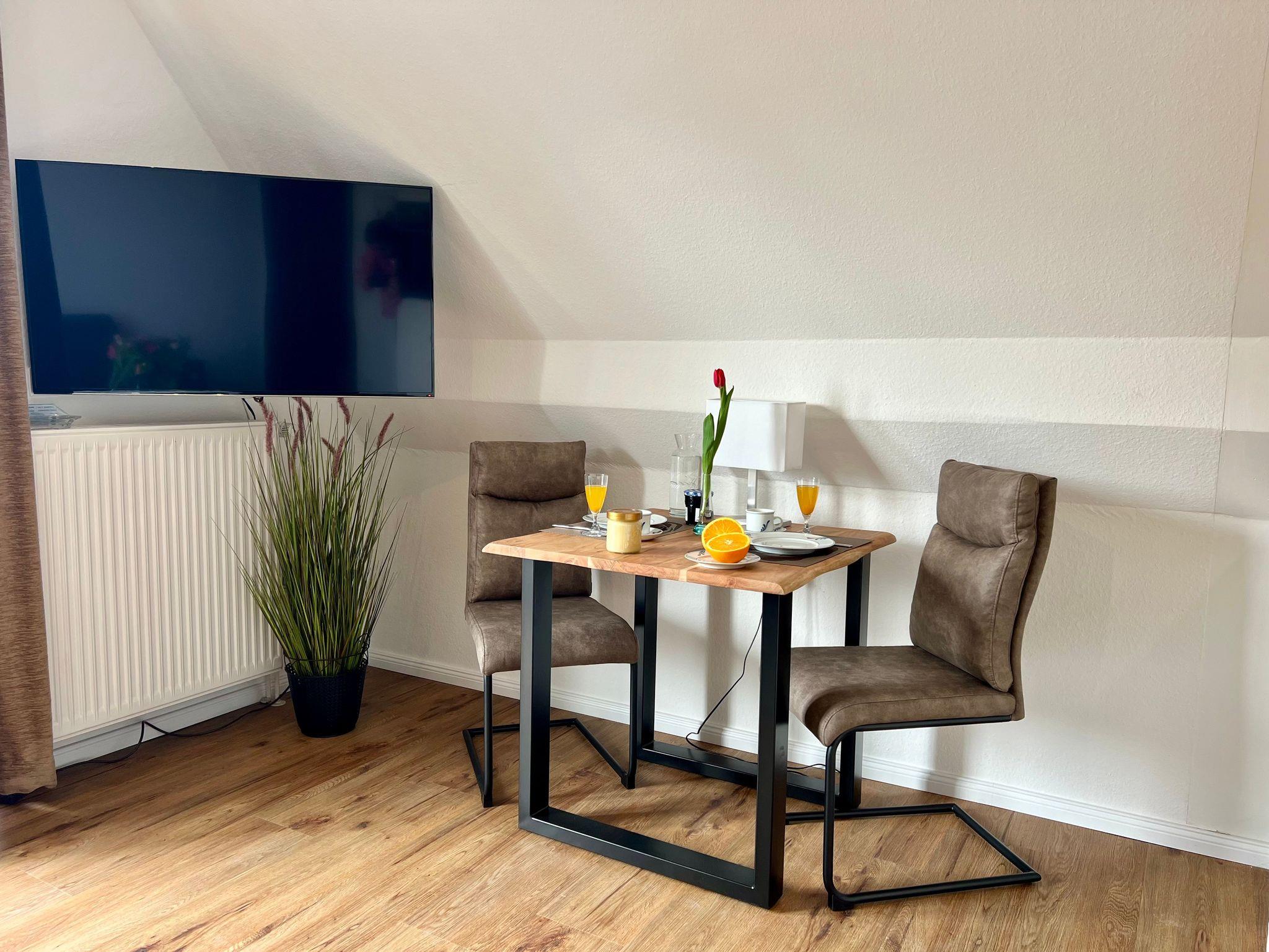 CA. 50 QM FÜR 2 PERSONEN + 1 KIND MIT BALKON Wohnraum mit Schlafcouch, 1 Sessel, Essbereich, SAT-TV, Laminatböden. Balkon nach Südwesten mit Gartenmöbel Schlafraum mit Doppelbett, 2 Nachttischen, großem Kleiderschrank, Wertfach Küchenzeile mit 2 Platteninduktionsherd, Geschirrspüler, Spüle, Kühlschrank. Weiterhin sind vorhanden Geschirr und Hausrat, Kaffeemaschine, Wasserkocher und Toaster Dusche/WC, Waschbecken, Spiegelschrank, Föhn.