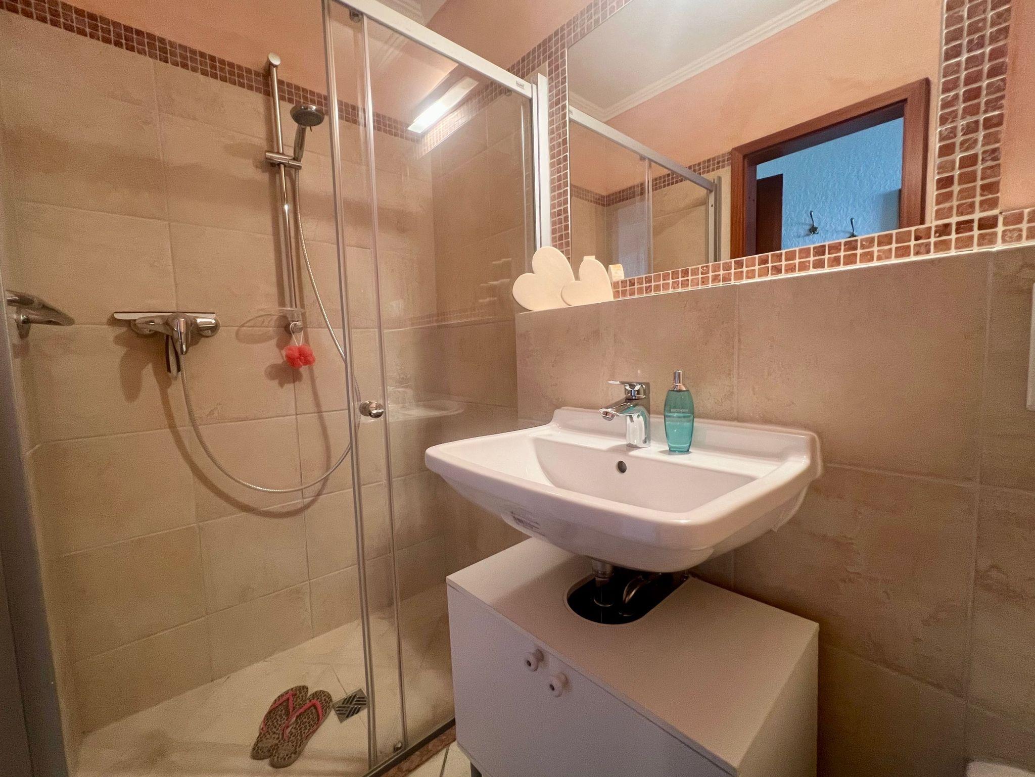 • Duschbad/WC, Waschbecken mit Spiegel, ausreichend Ablageflächen, Fußbodenheizung, Handtuchtrockner und Radio.
