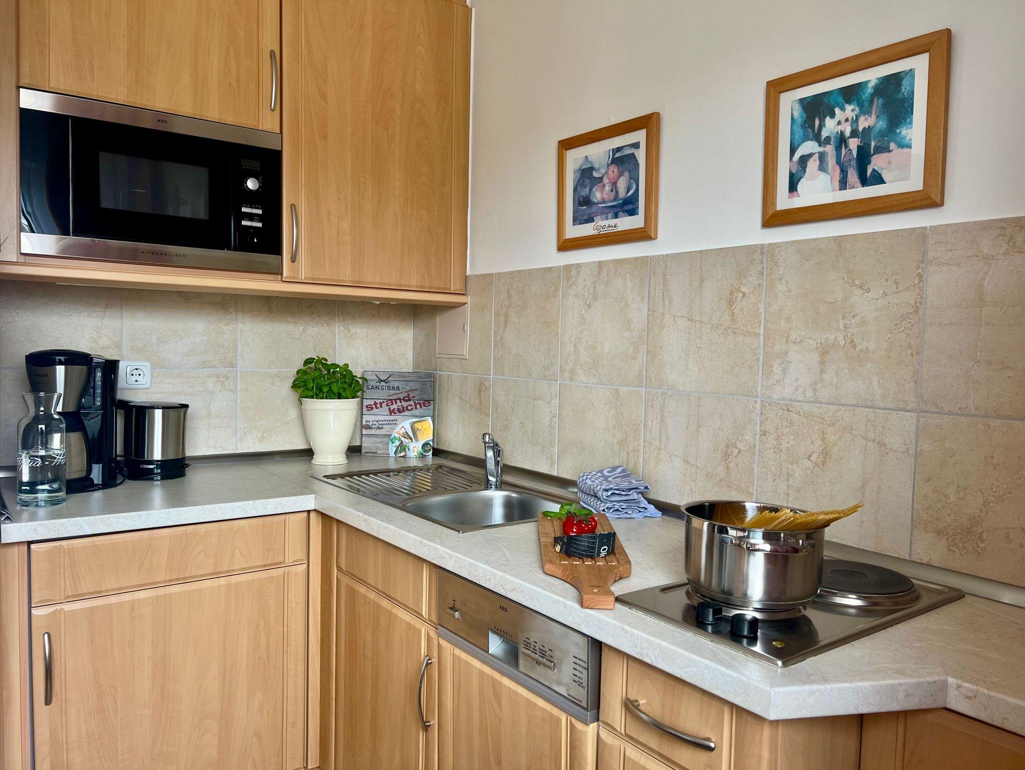 • Küchenzeile mit Kochfeld, Mikrowelle, Dunstabzugshaube, Geschirrspüler, Kühlschrank mit Gefrierfach, Kaffeemaschine, Toaster und Wasserkocher. Die Küche ist komplett bestückt mit Geschirr, Bestecken, Töpfen, etc.