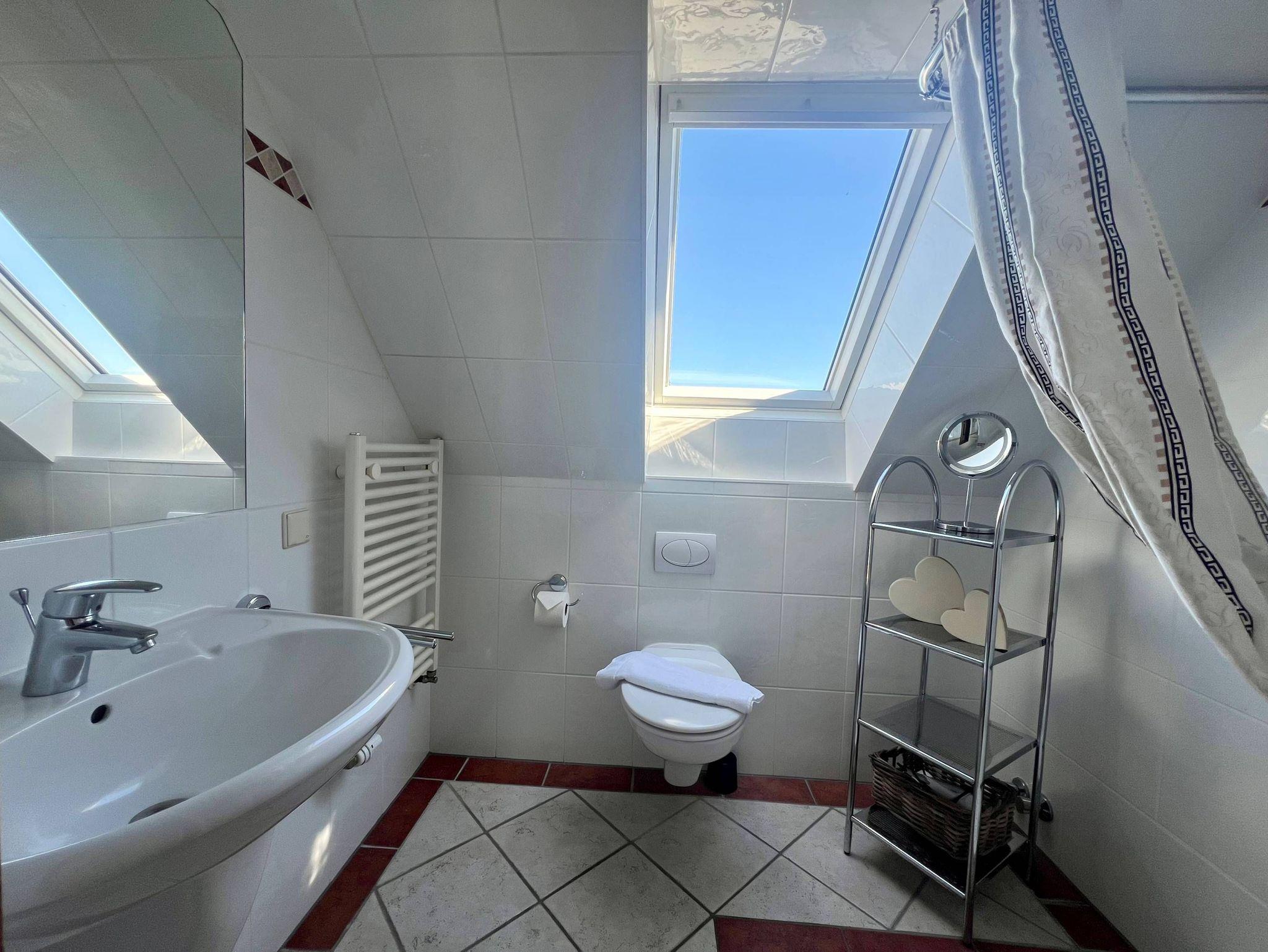 Modernes Bad mit Dusche, WC, Waschbecken mit Spiegel, ausreichend Ablageflächen, Fußbodenheizung, Handtuchtrockner und Radio.