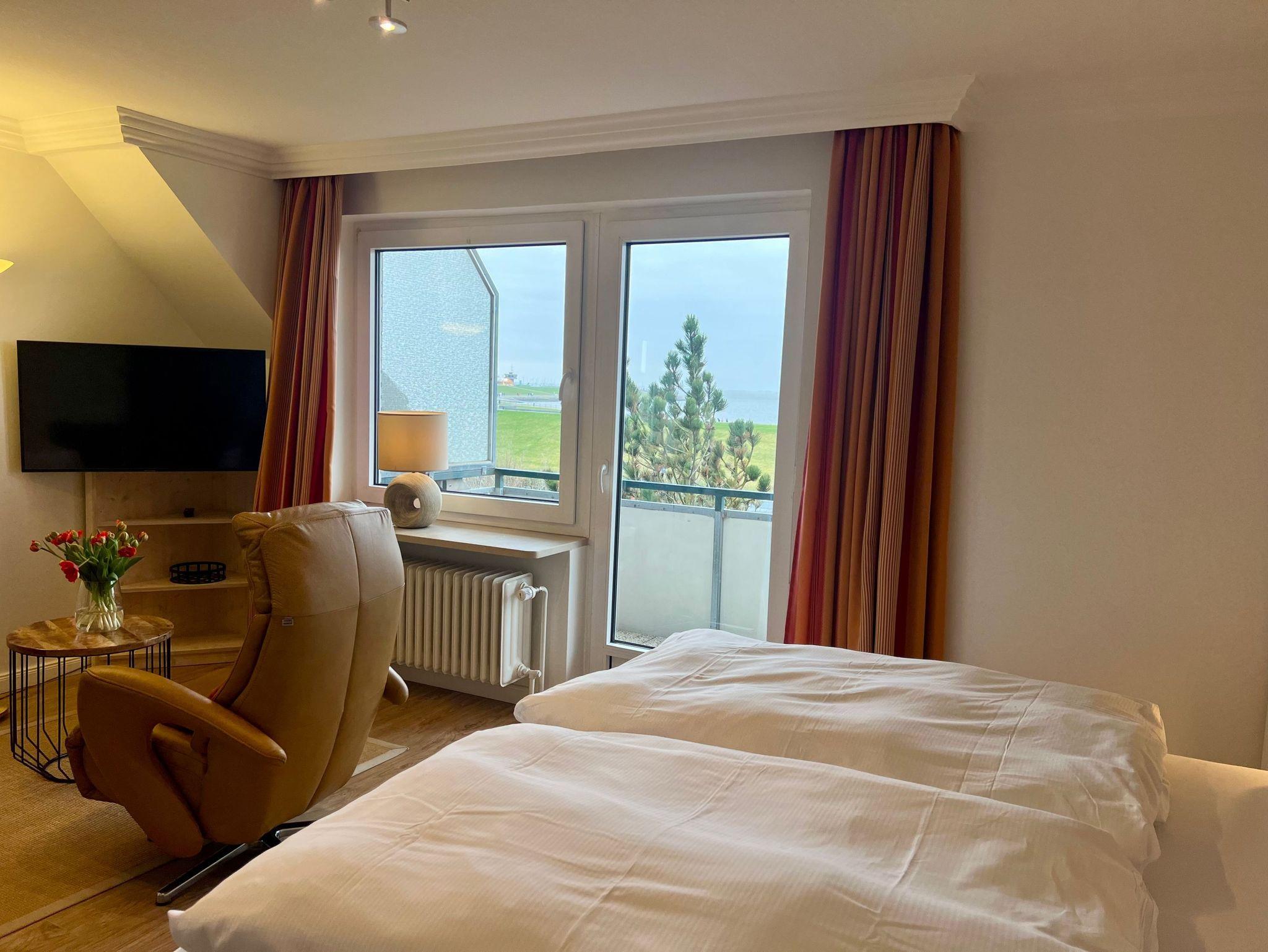 • Kombinierter Wohn-Schlafraum mit großem Doppelbett, 2 Sesseln, Esstisch mit Stühlen, SAT-TV, Stereoanlage, Balkon nach Südwesten mit Gartenmöbeln.