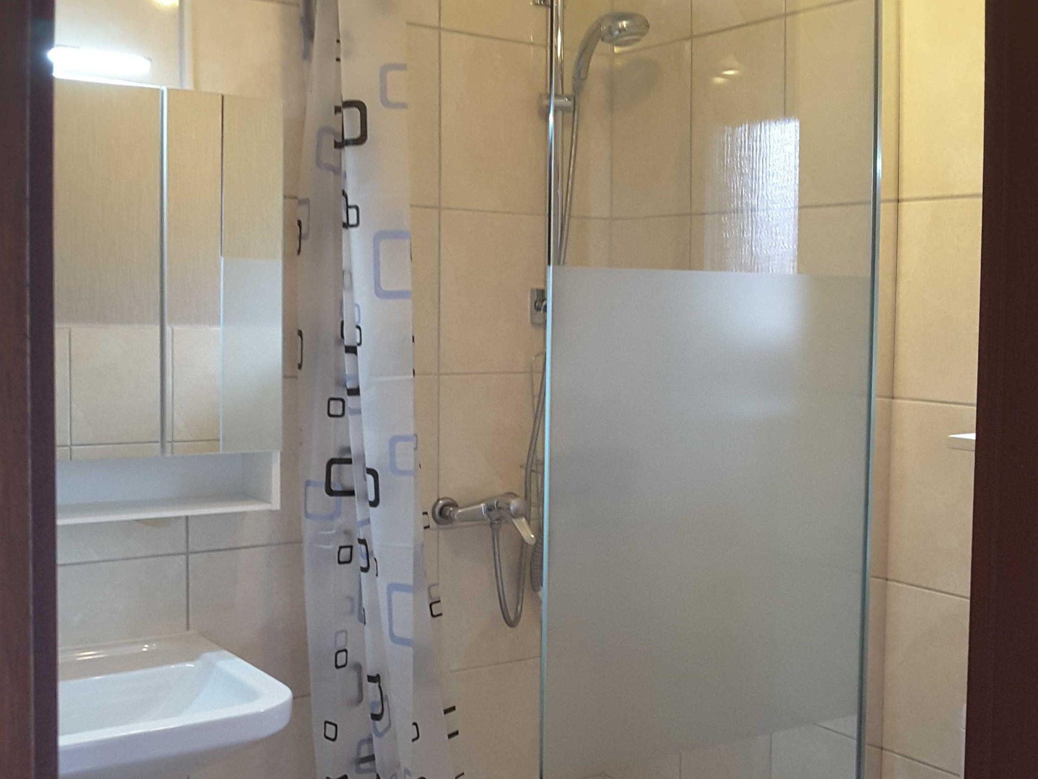 • Neues Duschbad/WC mit Waschbecken, Spiegelschrank und Ablagen, Haartrockner