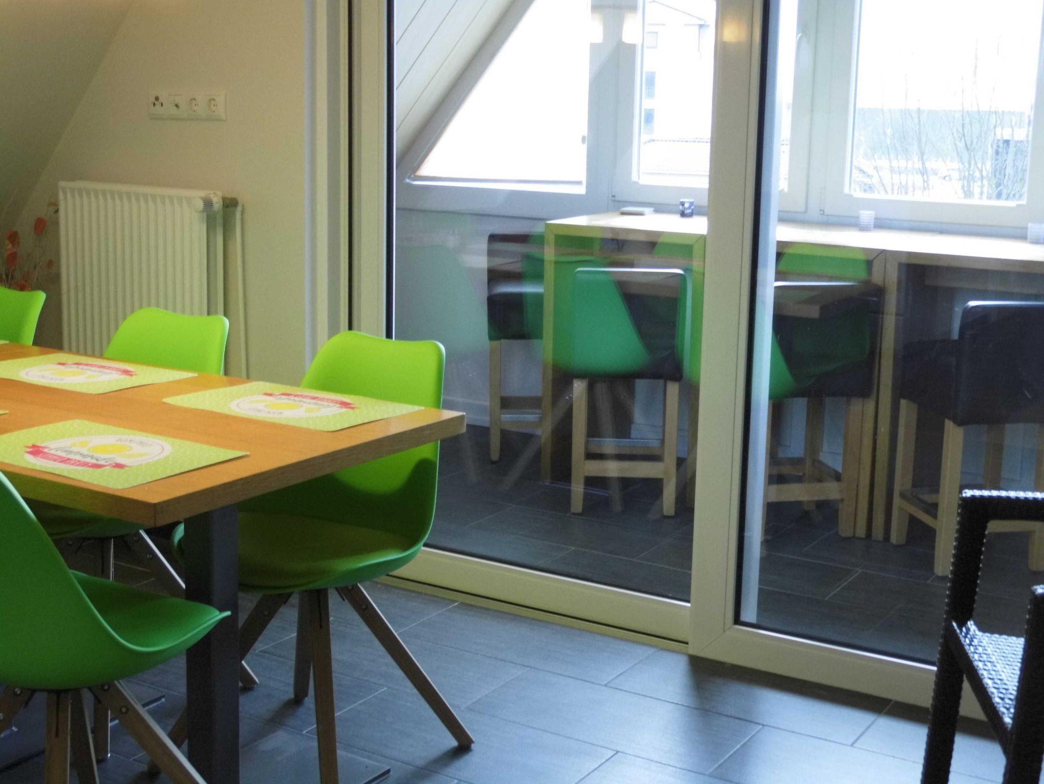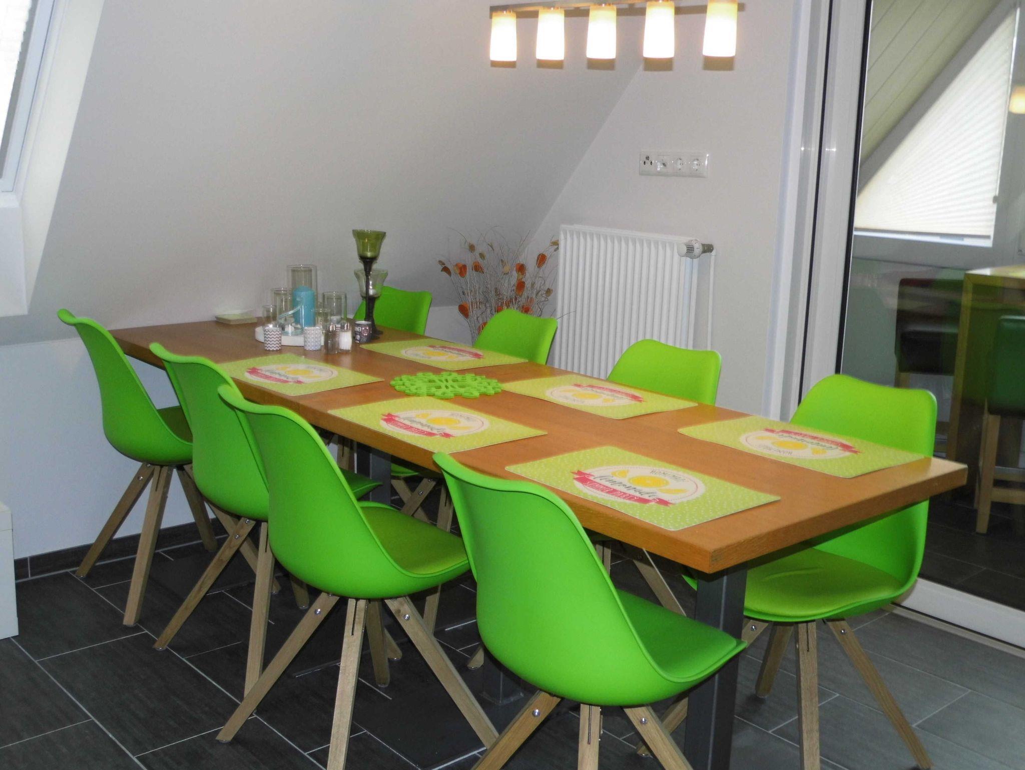• Im Wohnzimmer befindet sich ein großer Eßtisch sowie ein Flachbildfernseher