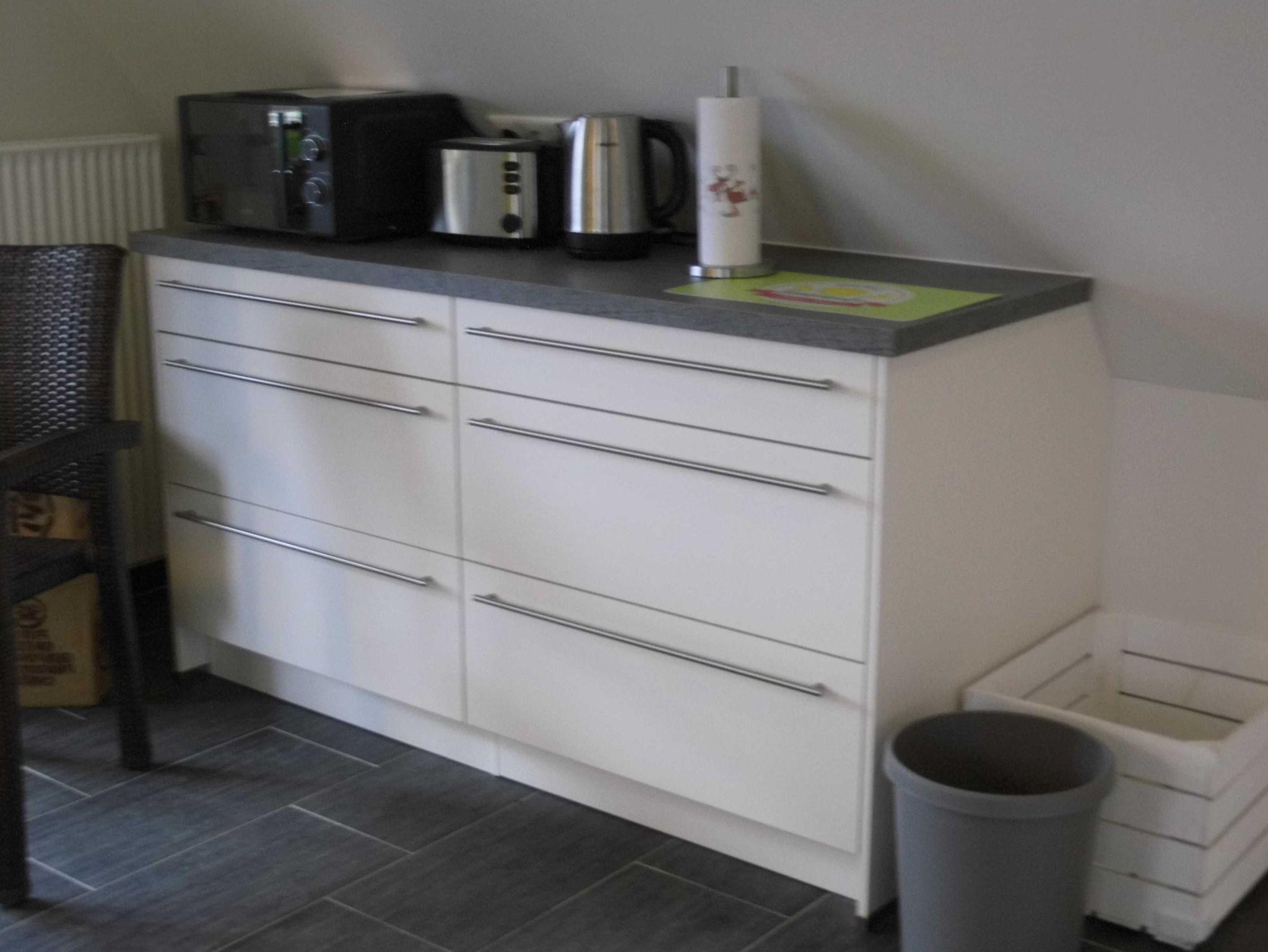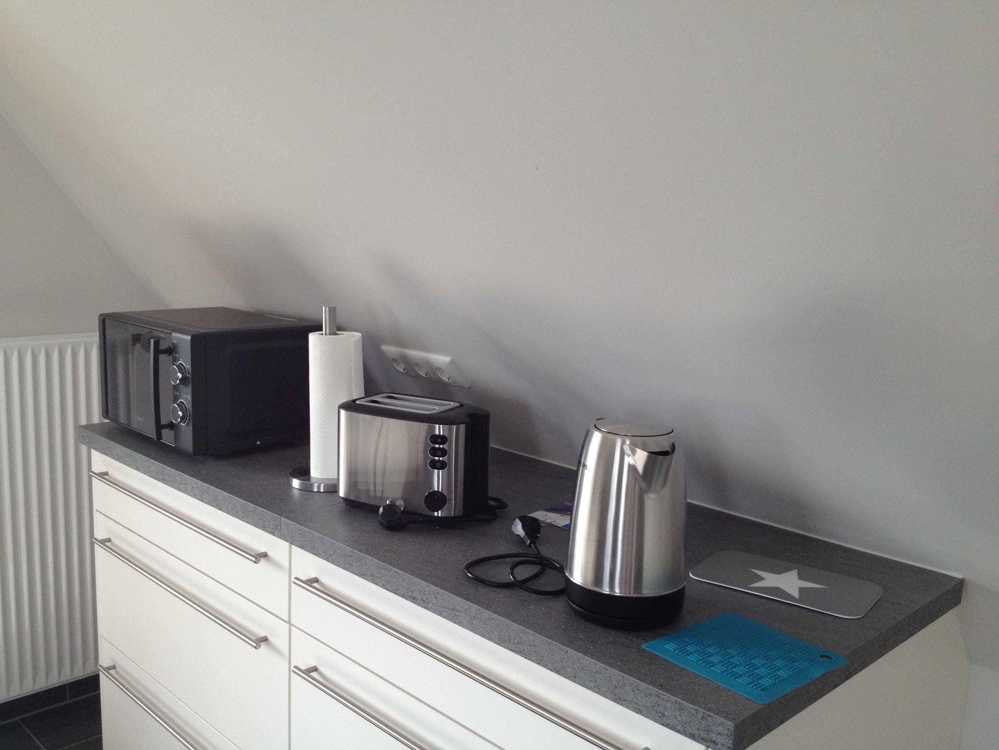 • neue offene Einbauküche mit Ceranfeld, Backofen, Geschirrspüler, Kaffeemaschine, Wasserkocher, Toaster.