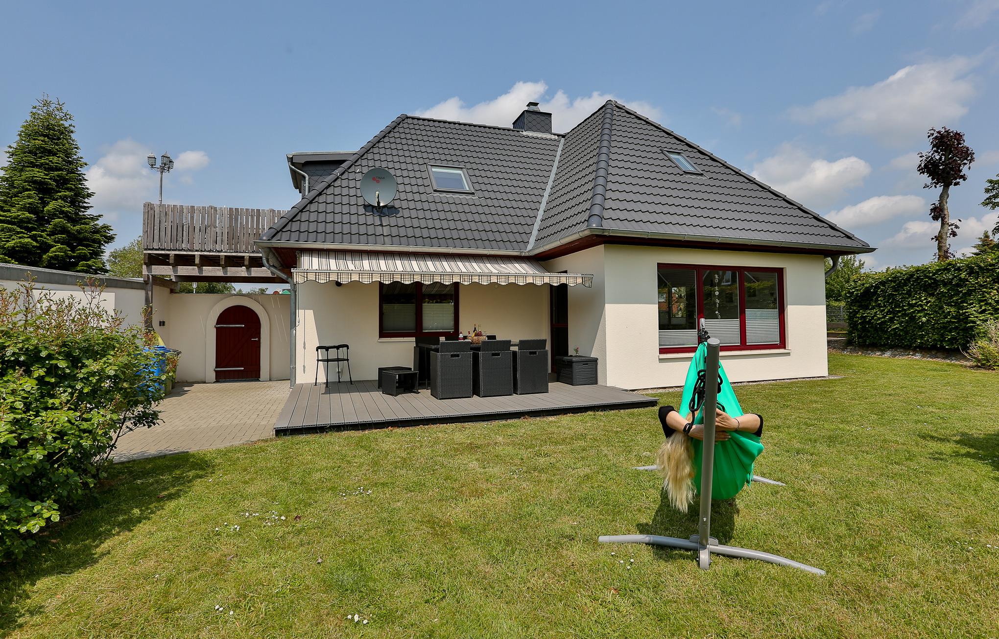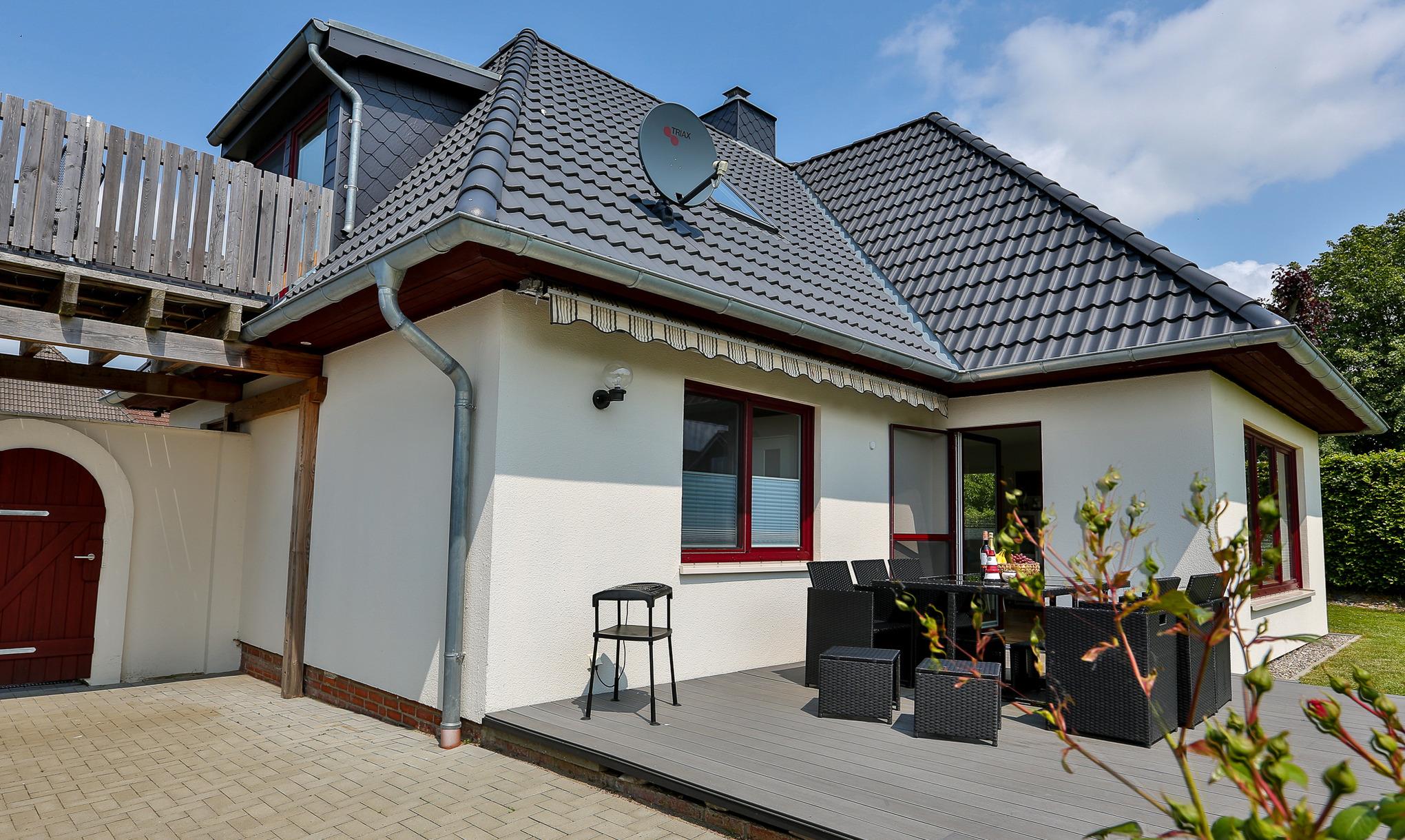 Auf der großen, barrierefrei erreichbaren Terrasse kann man gemütlich sitzen und laue Sommerabende genießen oder gemeinsam grillen (Der Grill steht für sie zur freien Verfügung) oder spielen.