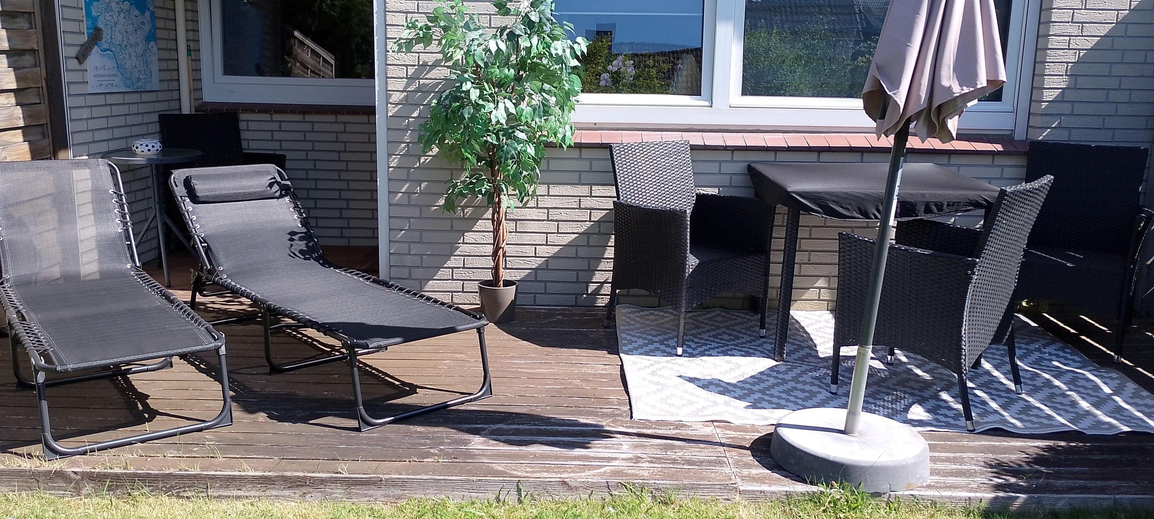 Eine tolle Holzterrasse mit Rattanmöbel. 2Liegen und Elektrogrill