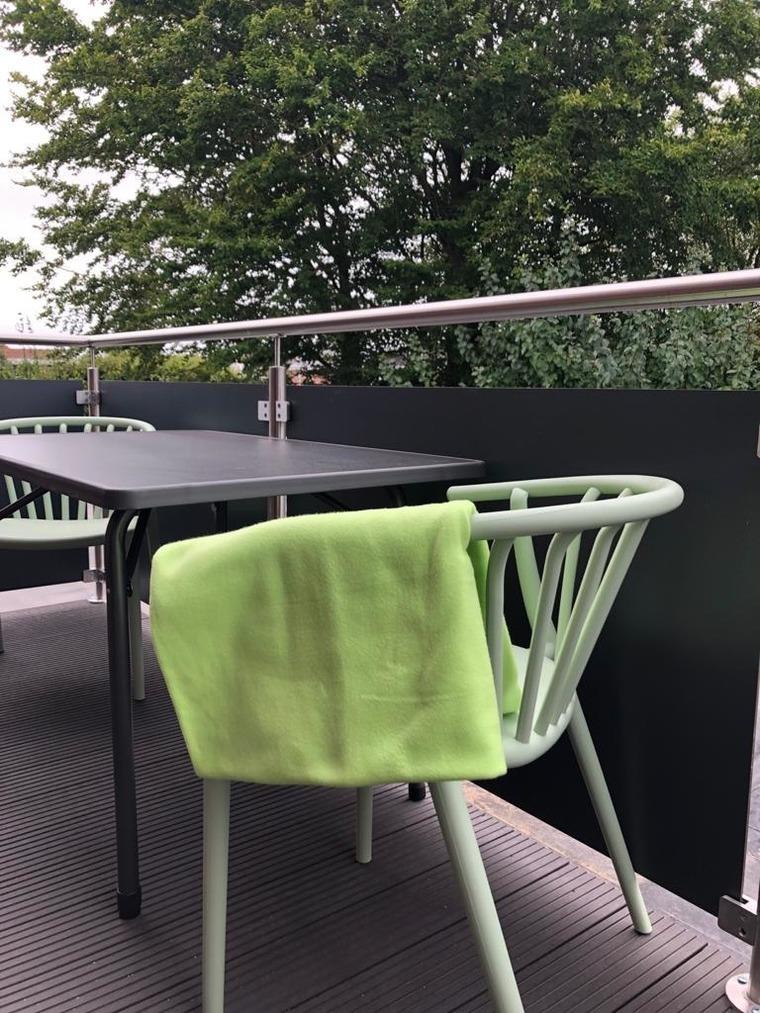 Der Balkon ist mit einem Tisch und zwei Stühlen ausgestattet.