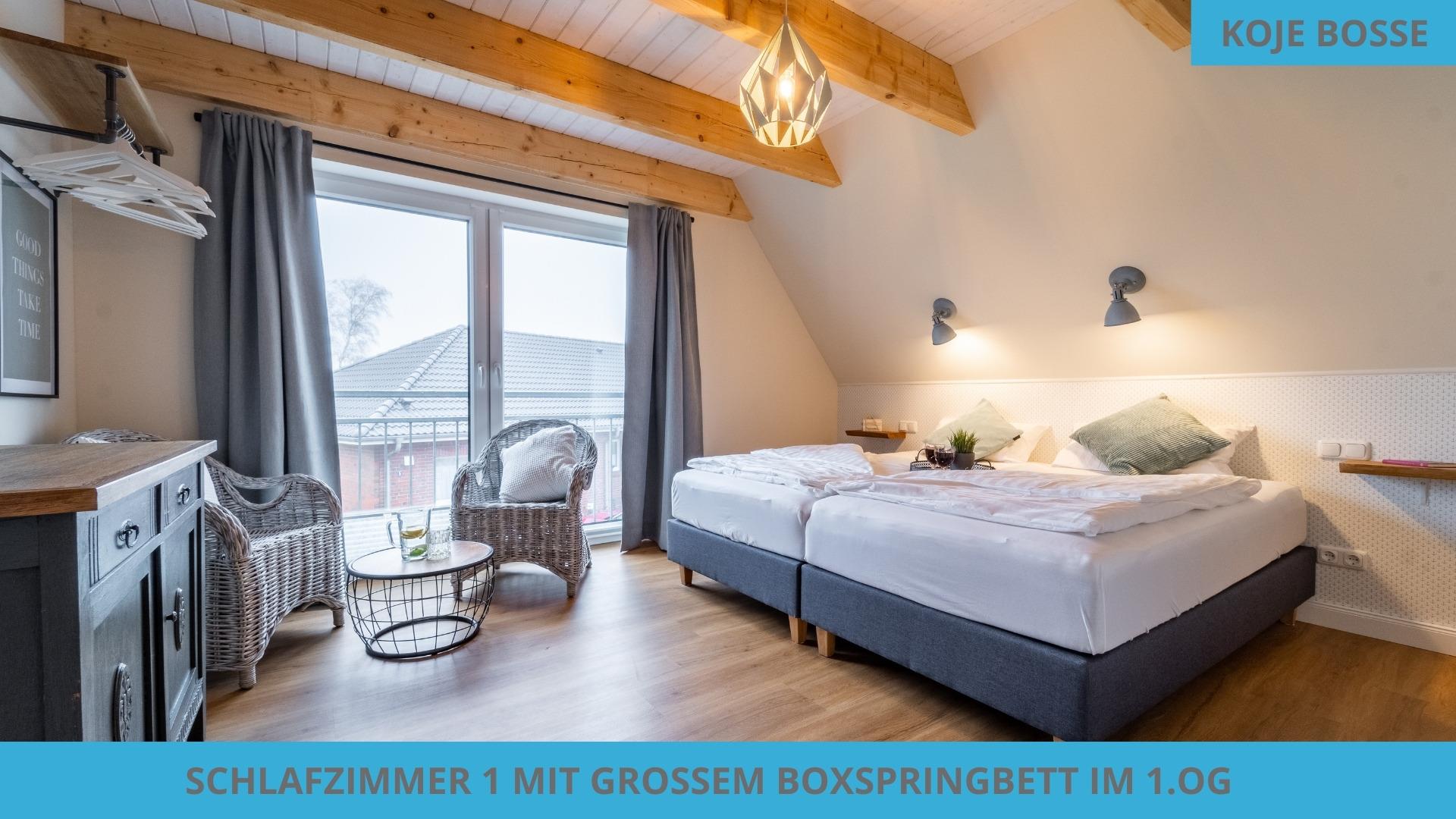 Im unteren Bereich befindet sich ein großes Schlafzimmer mit Boxspringbett für euren erholsamen Schlaf. Das Badezimmer mit begehbarer Dusche findet ihr direkt nebenan. Um gemeinsam zu kochen, zu spielen oder zu schnacken trefft ihr euch im großzügigen Wohn- und Essbereich. In der Lounge oder im Strandkorb genießt ihr den Blick auf den Sonnenuntergang.