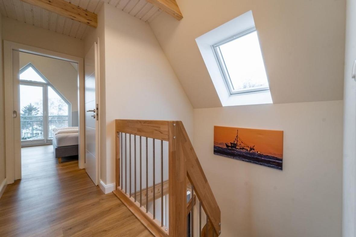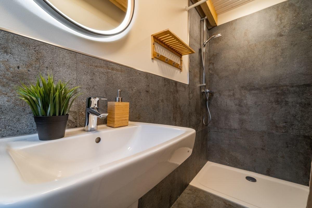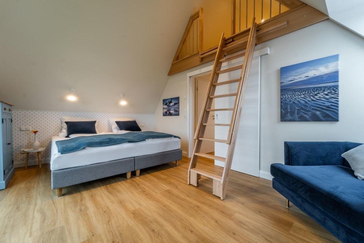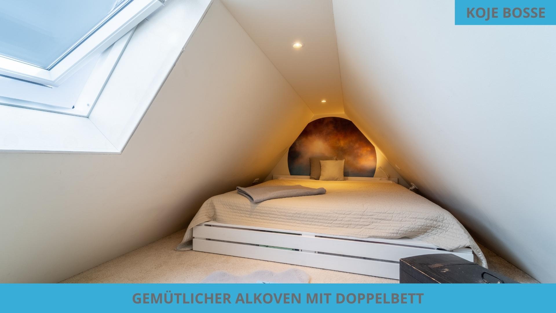 Im Dachgeschoss der Koje Bosse findet ihr ein weiteres hochwertig ausgestattetes Badezimmer. Für Familien oder dicke Freunde ist das zweite große Schlafzimmer inklusive Doppelbett auf dem Alkoven geeignet.