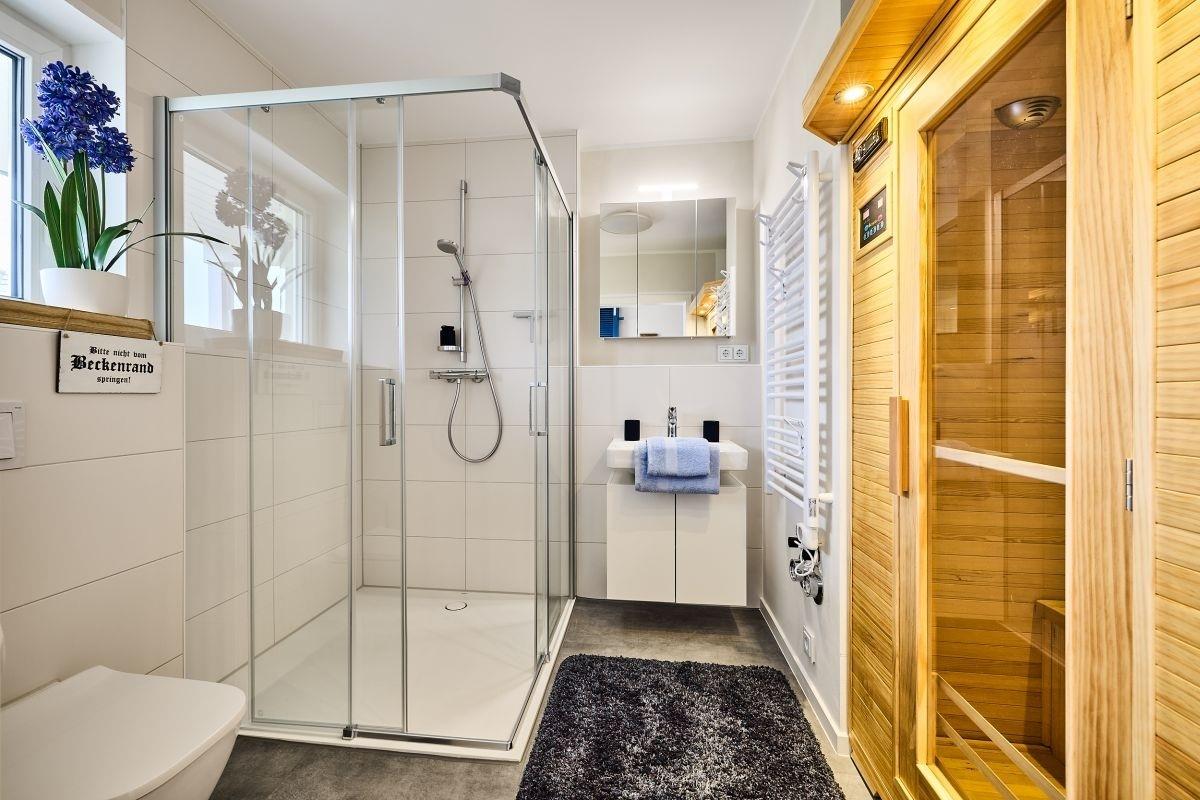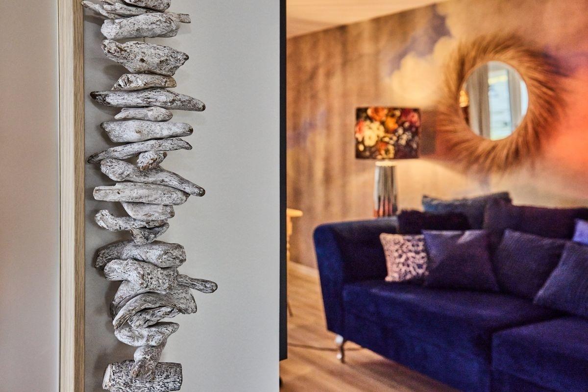 Design zum Wohlfühlen findet hier die ganze Familie. Zwei getrennte Schlafzimmer versprechen einen entspannten Schlaf. Das großzügige Familiensofa lädt zum Kuscheln am Kamin oder zum Entspannen nach dem Saunagang ein.