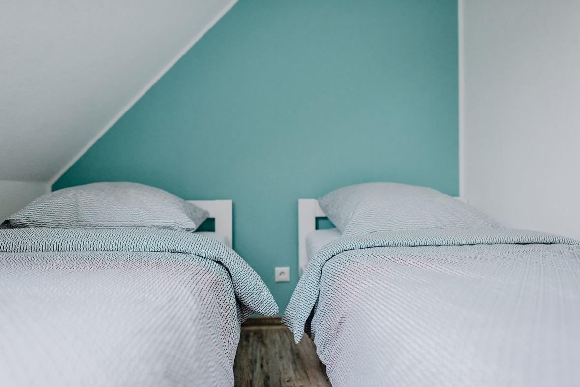 Eines der beiden Schlafzimmer ist mit einem Doppelbett (180x200, 2 Matratzen), Kleiderschrank und TV- Gerät eingerichtet. Das Zweite Schlafzimmer ist mit 2 Einzelbetten und einem Kleiderschrank möbliert.