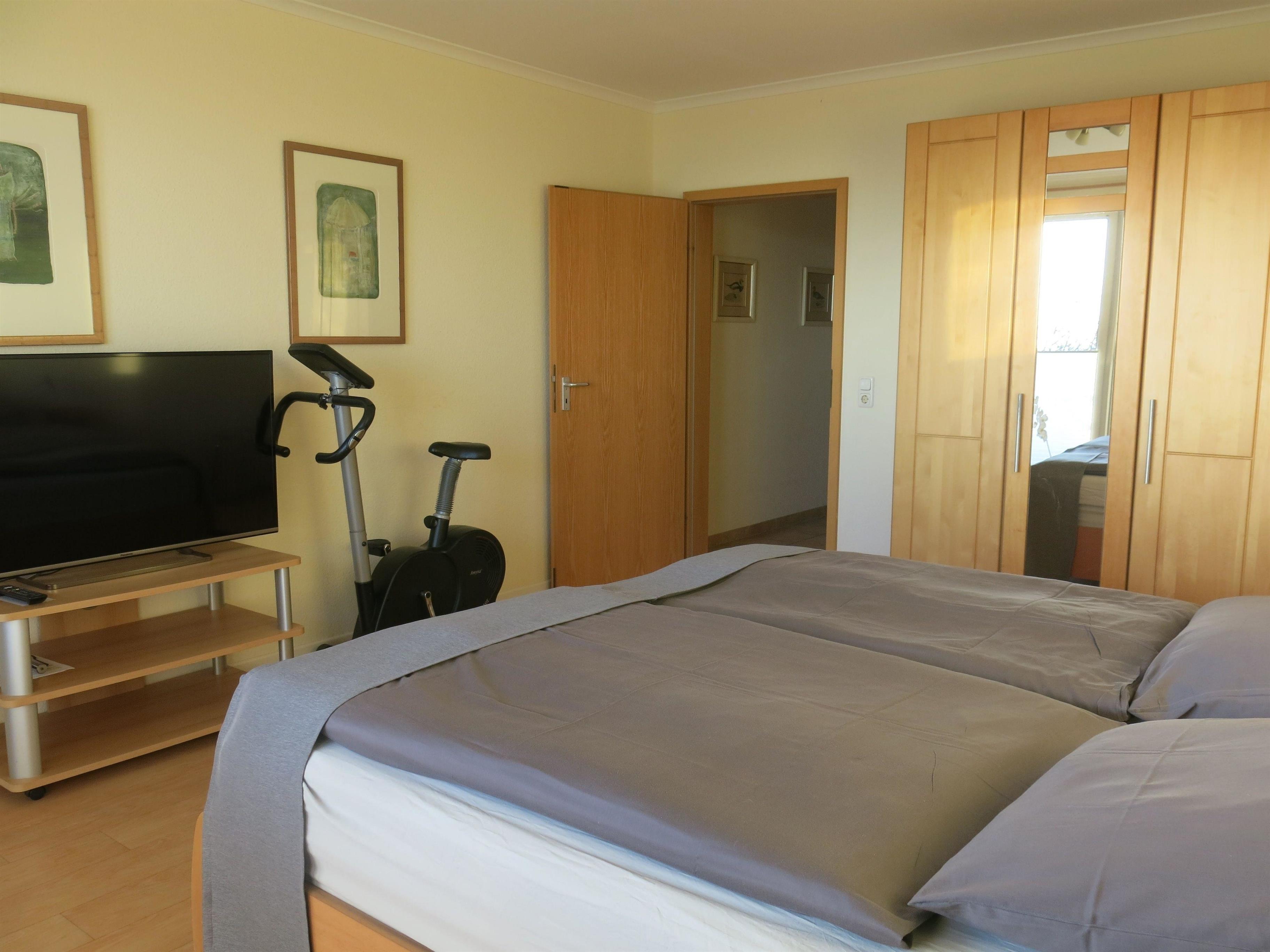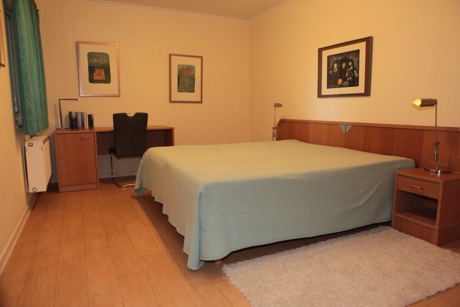 2 große Schlafzimmer mit Doppelbett, Schreibtisch, großes Badezimmer mit 2 Waschbecken, Dusche und WC, separates Gäste-WC, Hauswirtschaftsraum, 2 Fernseher HD, DVD, Video, Stereoanlage, Fitnessgeräte, viele Bücher und Bilder, Internet-Flatrate (W-Lan),