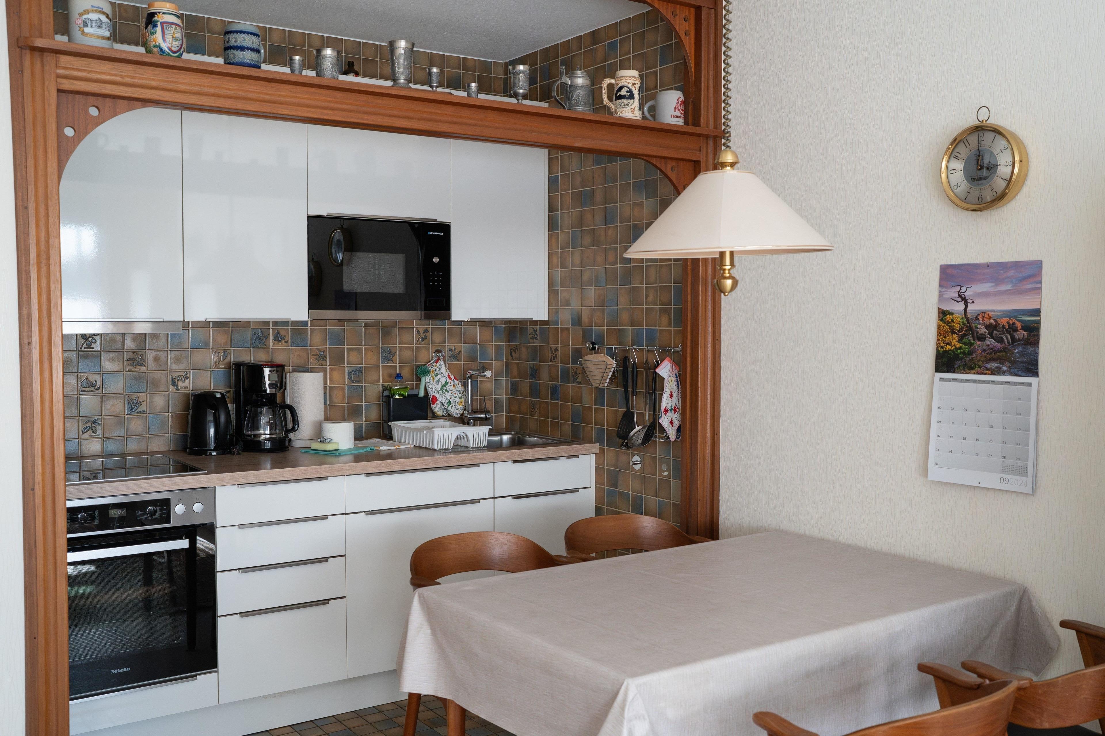 Der offene Küche ist ausgestattet mit einem Herd (Induktion), einem Backofen/Mikrowellen Gerät, einer Spülmaschine, einem Kühl- und Gefrierschrank, einem Wasserkocher und vielen weitere Küchenutensilien.