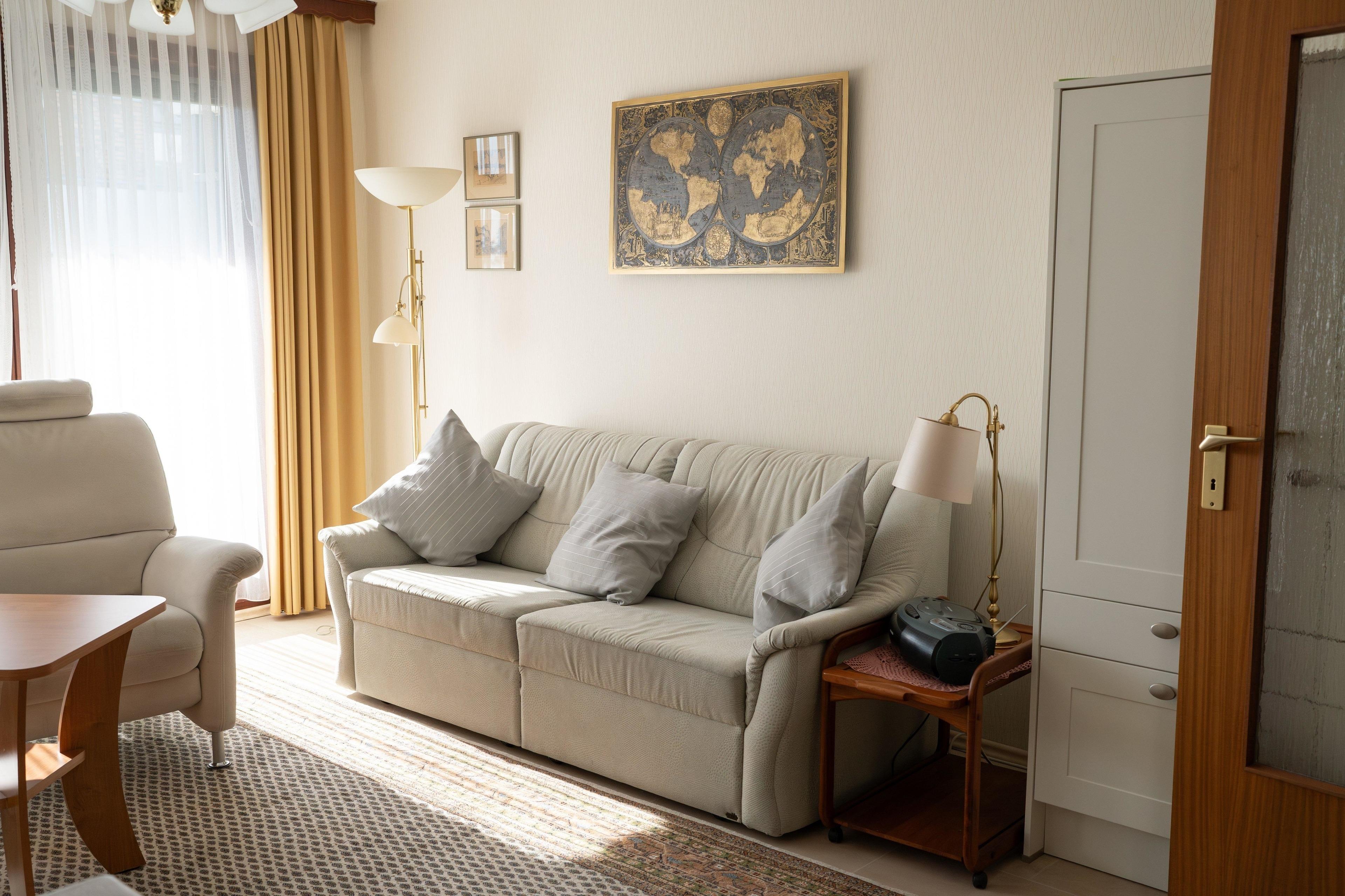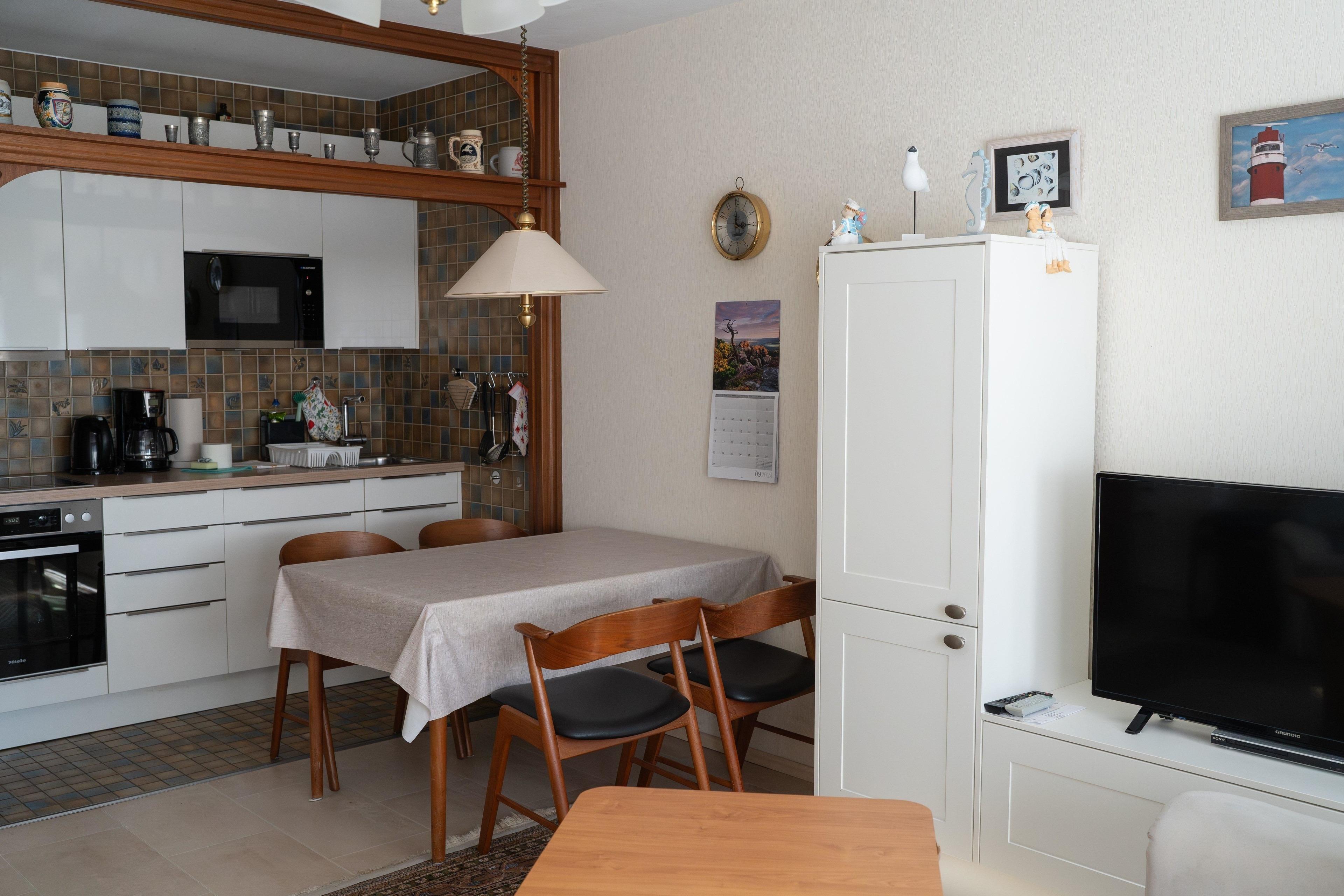 Die Sitzecke im Wohn-/Essbereich bietet Platz für mind. 4 Personen. Zusätzlich zum TV mit Kabelanschluss befindet sich hier ebenfalls ein Radio, ein DVD-Player sowie ein Festnetztelefon.
