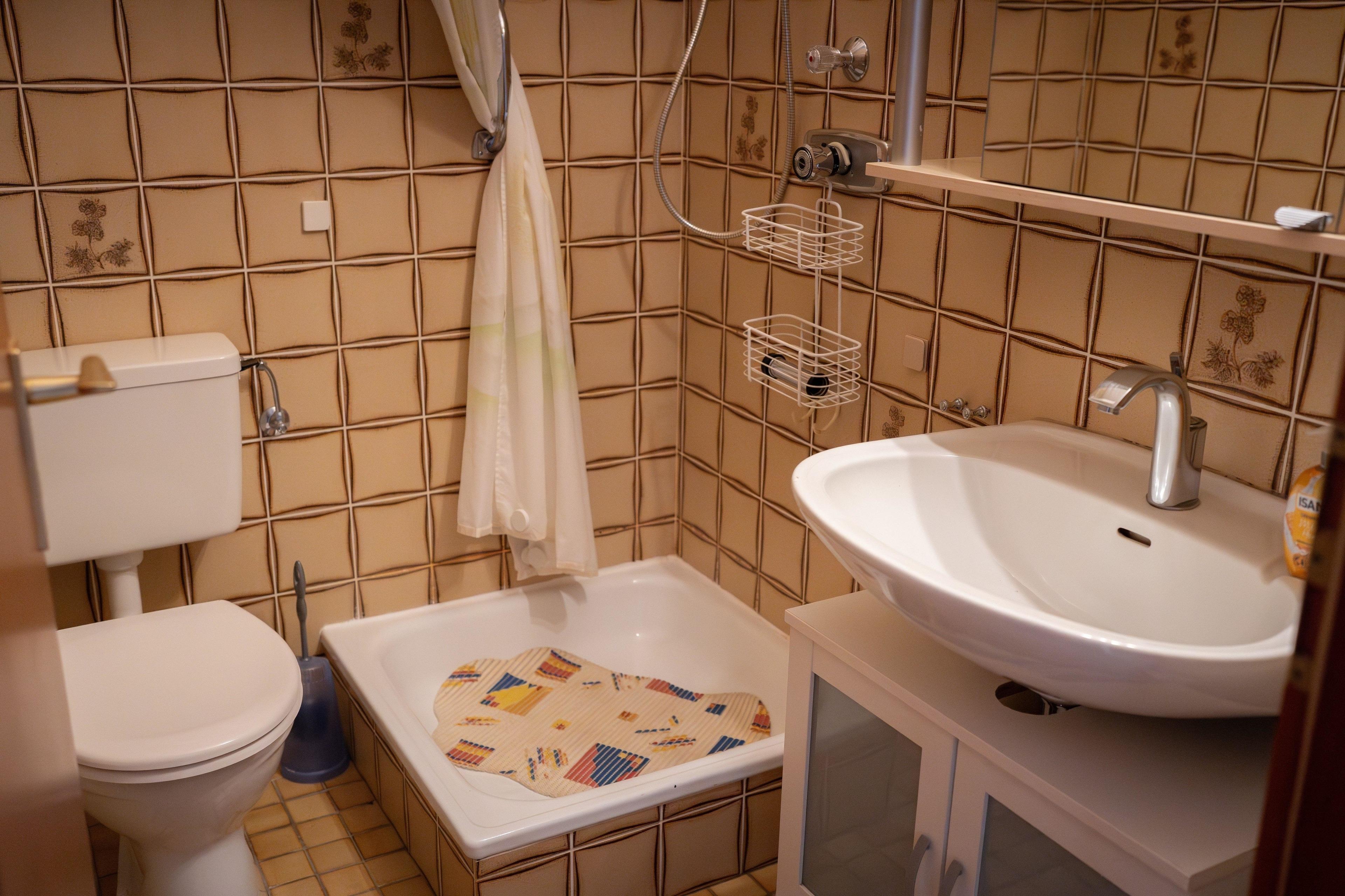 Das Bad bietet neben dem WC eine Dusche und ein Waschbecken mit Spiegelschrank.