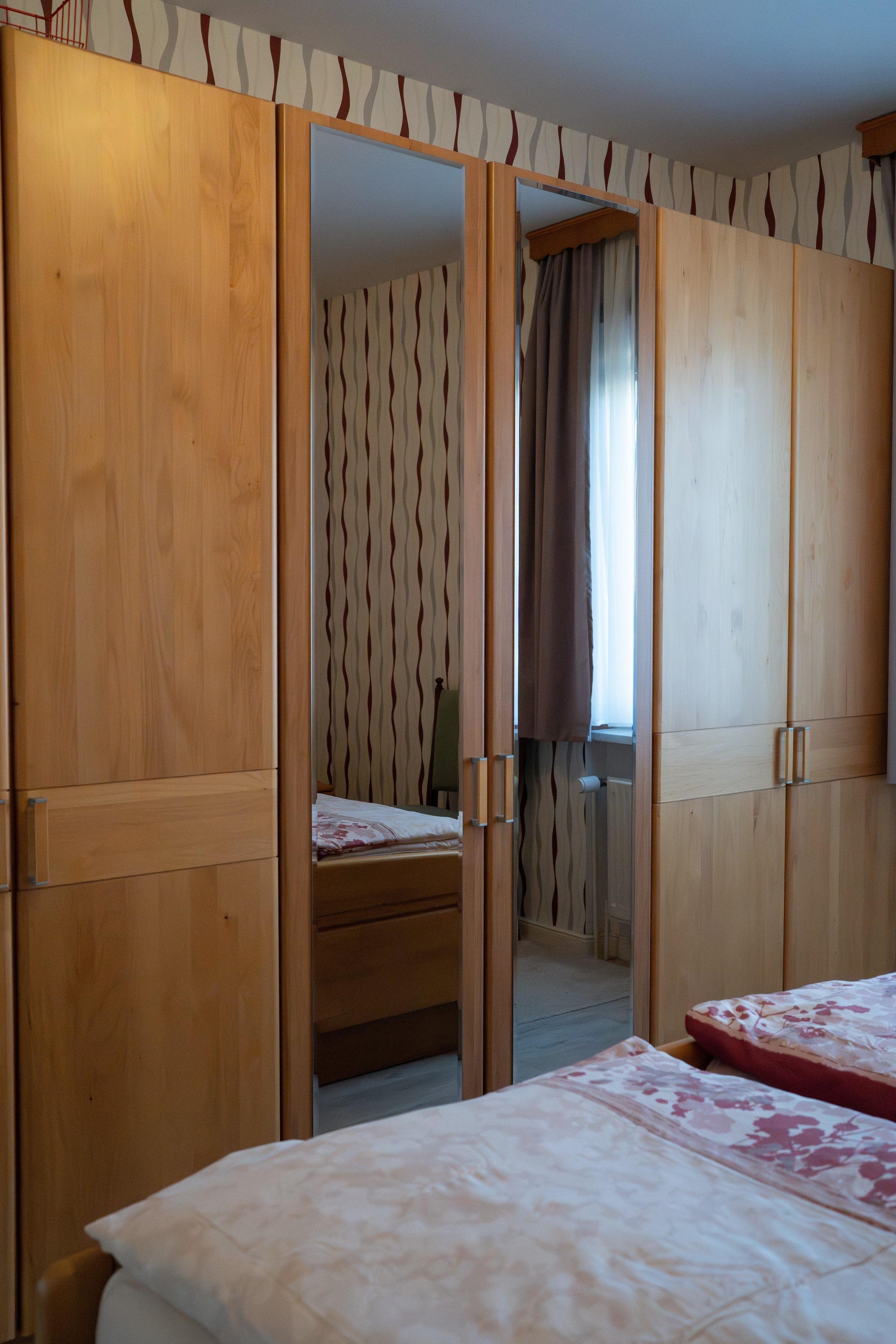 Im Schlafzimmer befindet sich ein Doppelbett mit zwei getrennten Matratzen, die eine Gesamtbreite von 180 cm bieten. Hier gibt es ebenfalls einen Kleiderschrank.