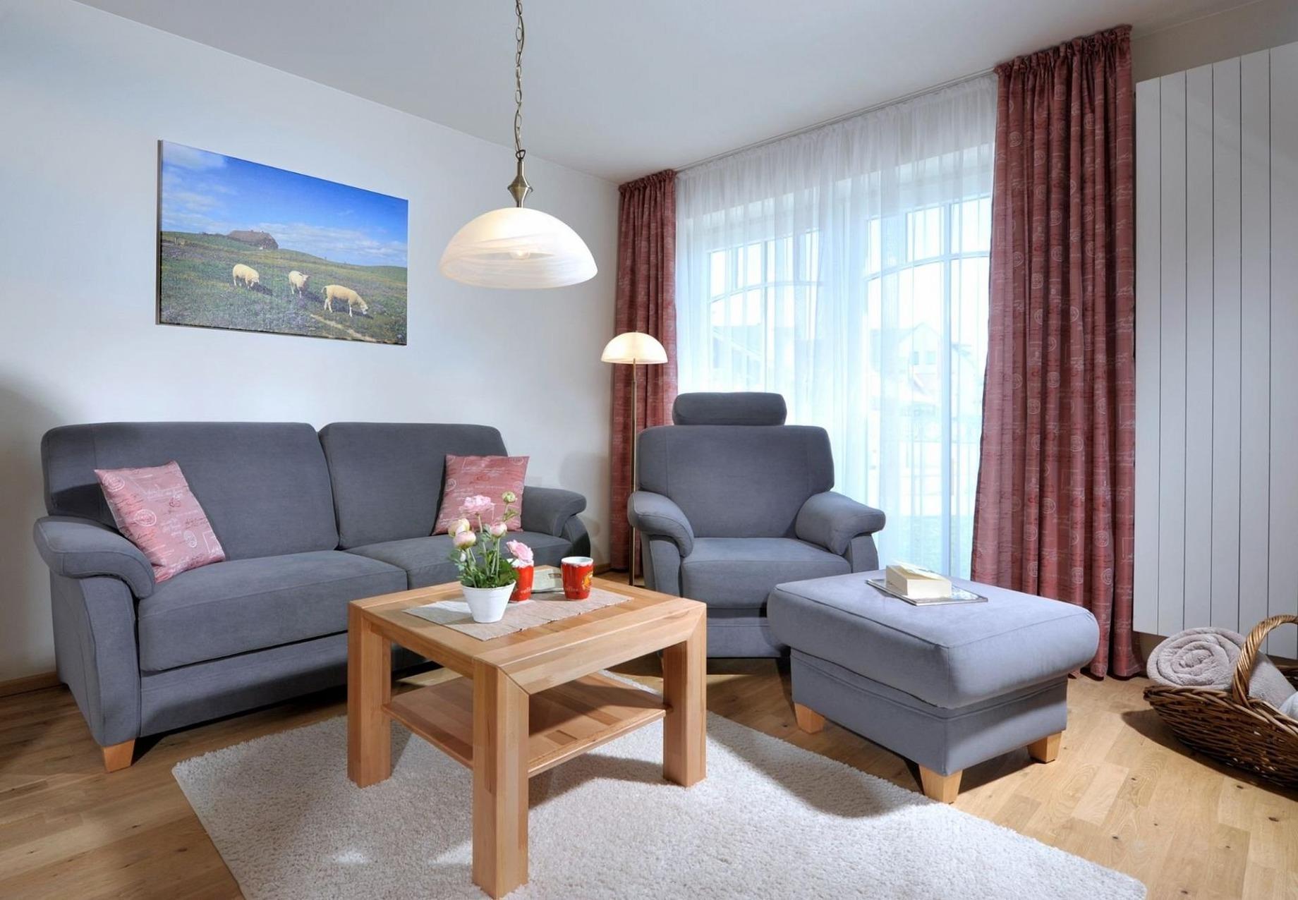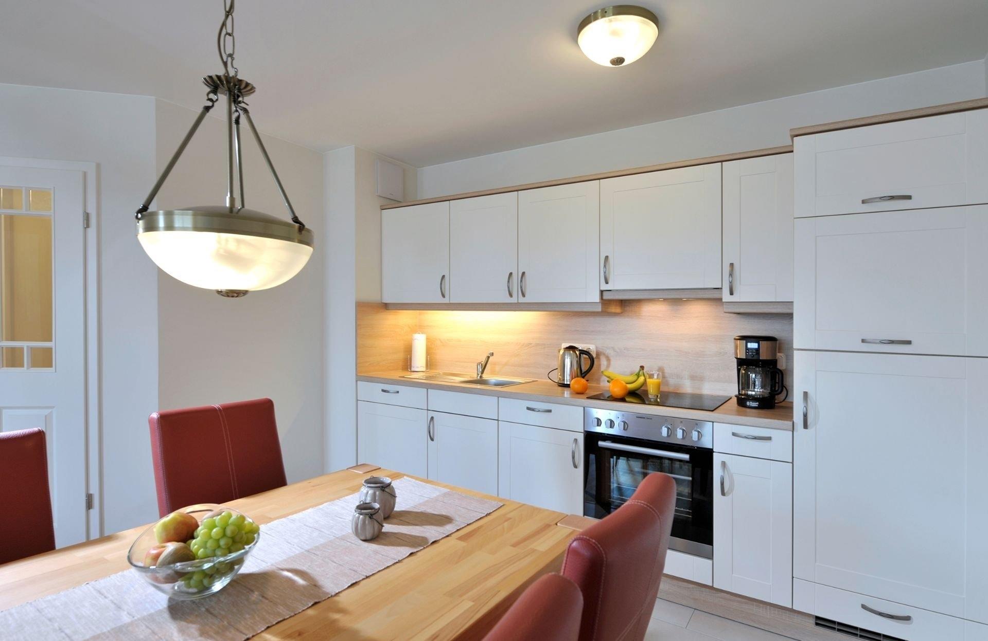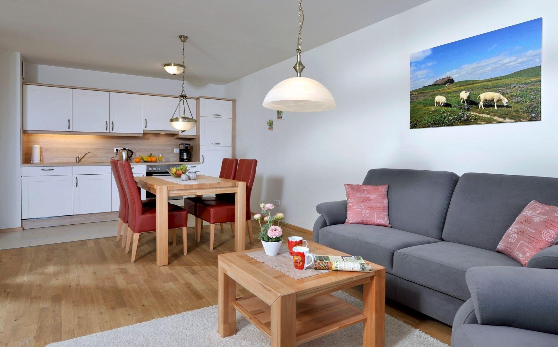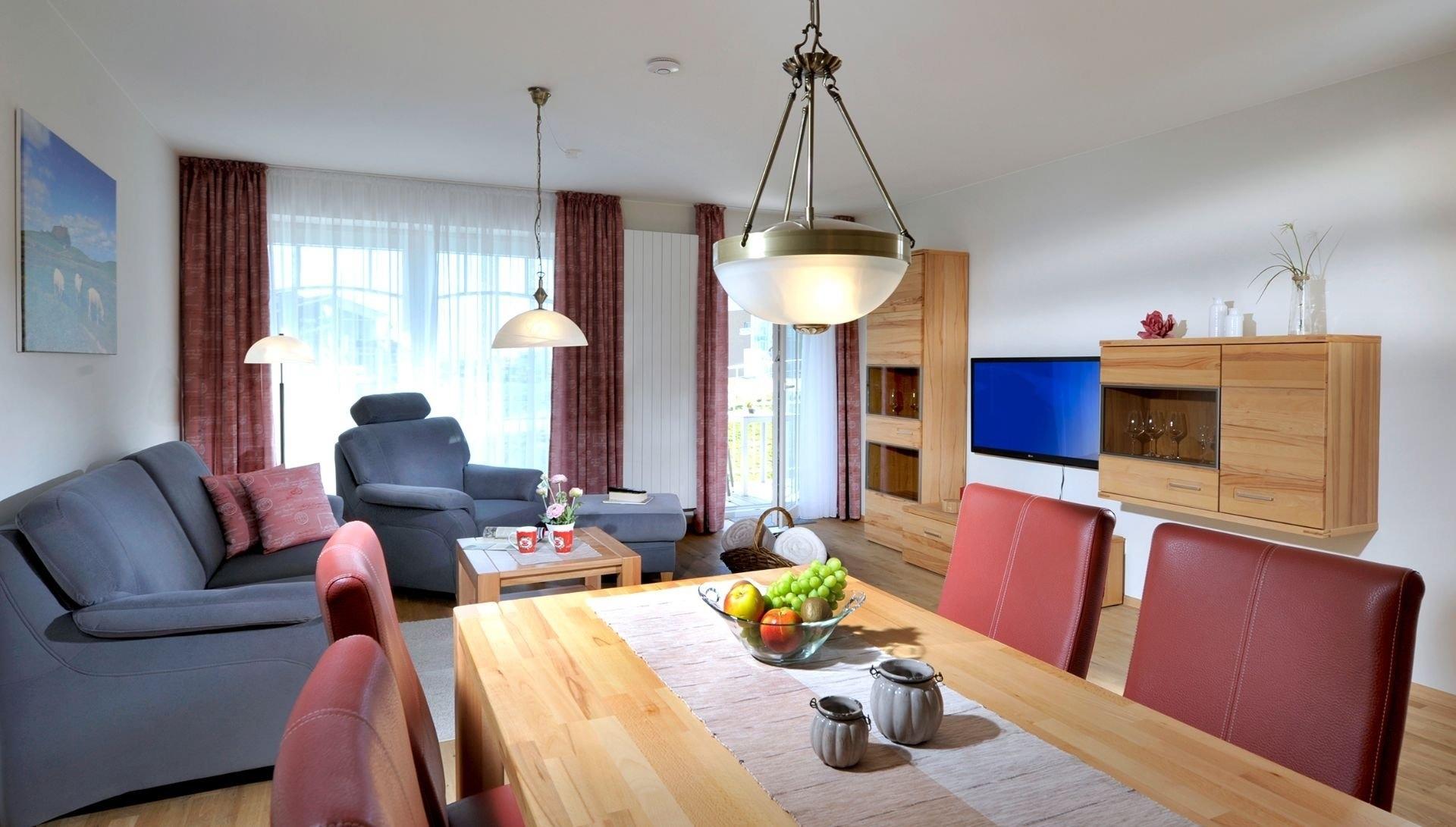 Die Ferienwohnung befindet sich im ersten Stock und ist ideal für zwei Personen. Die großen Fenster in Südausrichtung gewähren lichtdurchflutete Räume und einen schönen Ausblick. Holzfußböden im großzügigen Wohn- und Esszimmer und im Schlafzimmer sowie eine hochwertige Schallisolierung sorgen für eine angenehme und erholsame Atmosphäre. Besonderen Komfort bieten wir mit einer hochwertigen Ausstattung der Ferienwohnung und stufenfreien Zugängen mittels Aufzug und Walk-In-Dusche im Bad. Auf dem möblierten Balkon können Sie bei schönem Wetter bis zum frühen Abend die Sonne genießen. Sie werden sich zu jeder Jahreszeit und bei jedem Wetter bei uns wohl fühlen.