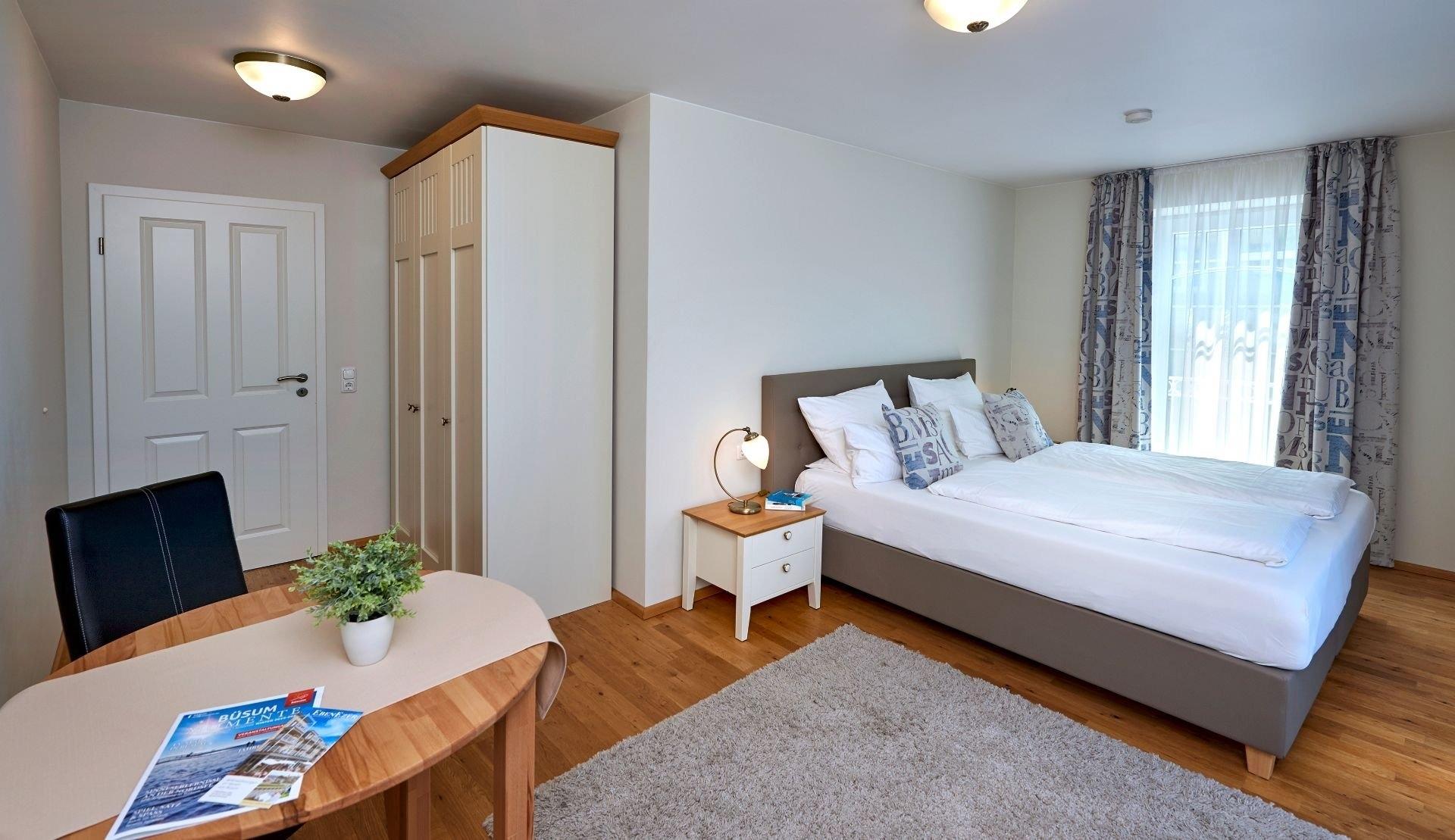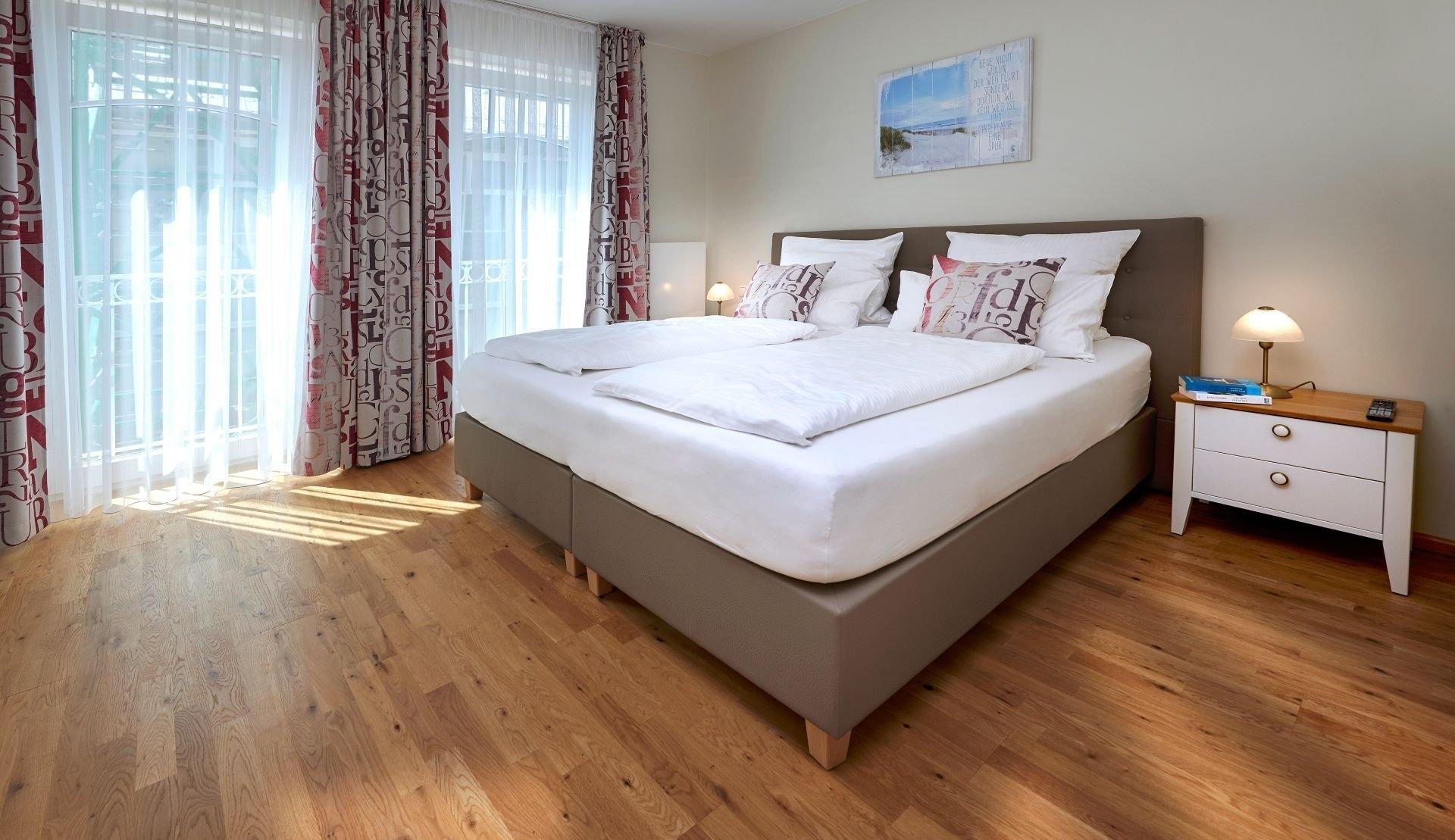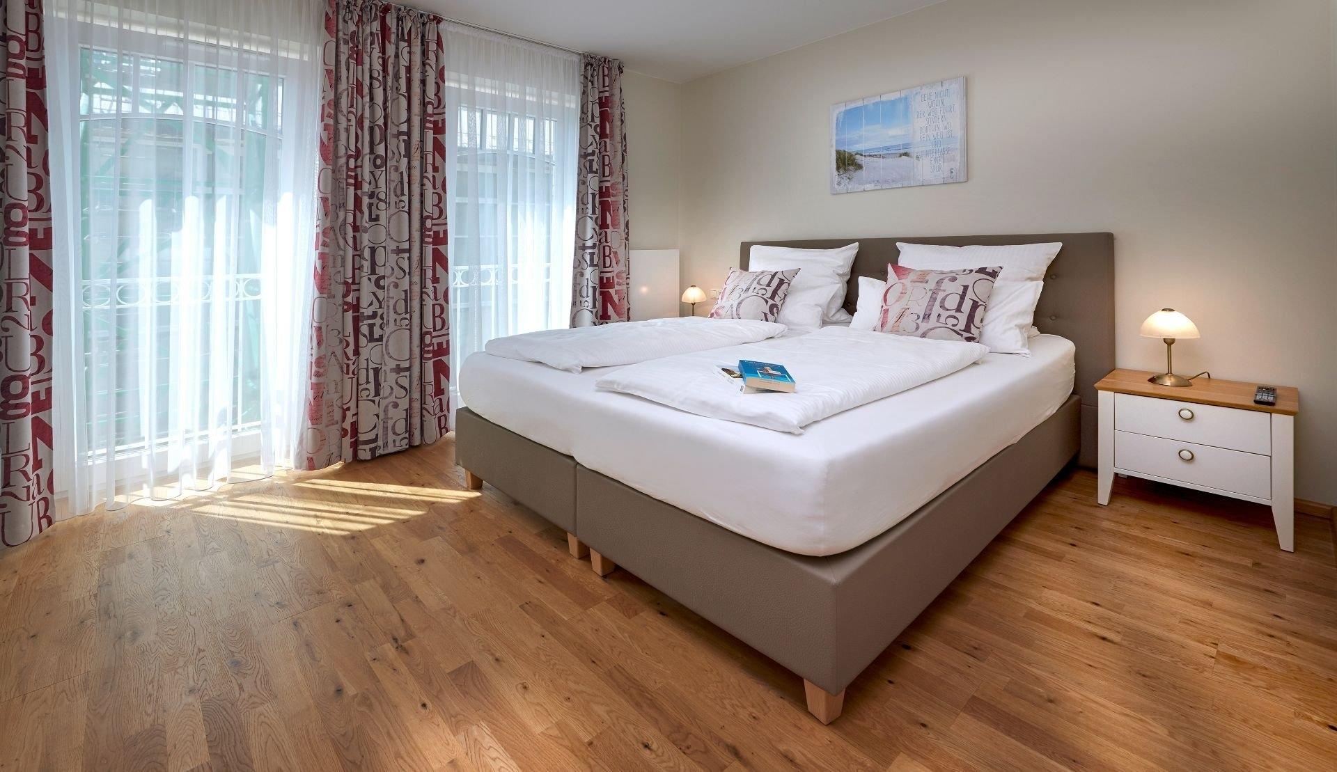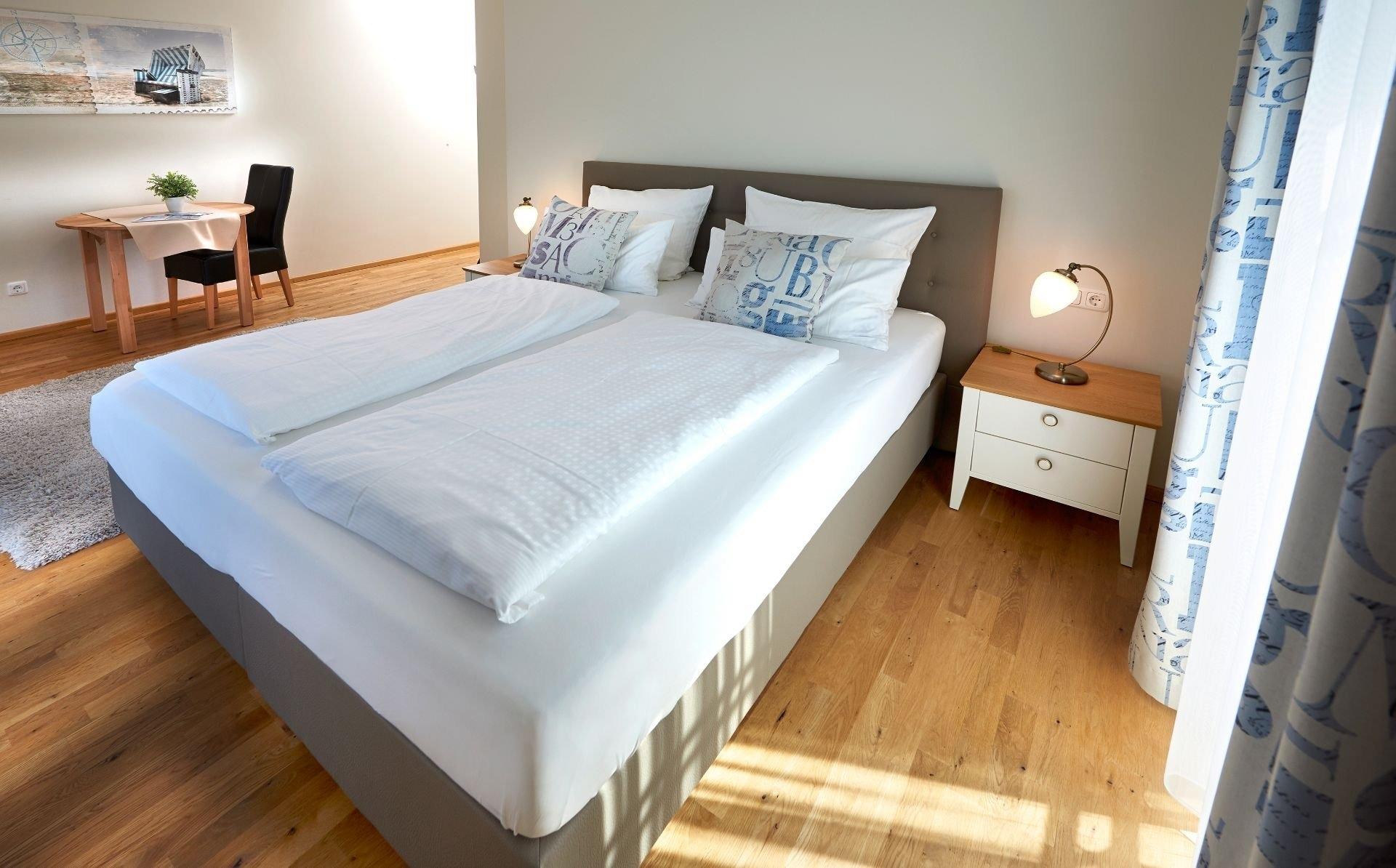 Die im zweiten Stock liegende großzügige Ferienwohnung ist mit zwei Schlafzimmern und einem separaten Gäste-WC auch für Familien perfekt. Mit großen Fenstern in Süd- und in Südwestausrichtung bieten wir unseren Gästen lichtdurchflutete Räume und einen herrlichen Blick auf den Museumshafen. Im kombinierten Wohn- und Esszimmer haben Sie viel Platz für gemeinsame Aktivitäten oder Entspannung. Holzfußböden in allen Wohn- und Schlafzimmern und eine hochwertige Schallisolierung sorgen für eine angenehme und erholsame Atmosphäre. Besonderen Komfort bieten wir mit einer hochwertigen Ausstattung der Ferienwohnung und stufenfreien Zugängen mittels Aufzug und Walk -In-Dusche im Bad. Auf dem möblierten großzügigen Balkon können Sie bei schönem Wetter nahezu den ganzen Tag die Sonne genießen. Sie werden sich zu jeder Jahreszeit und bei jedem Wetter bei uns wohl fühlen.