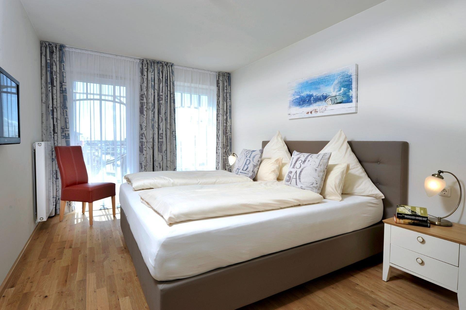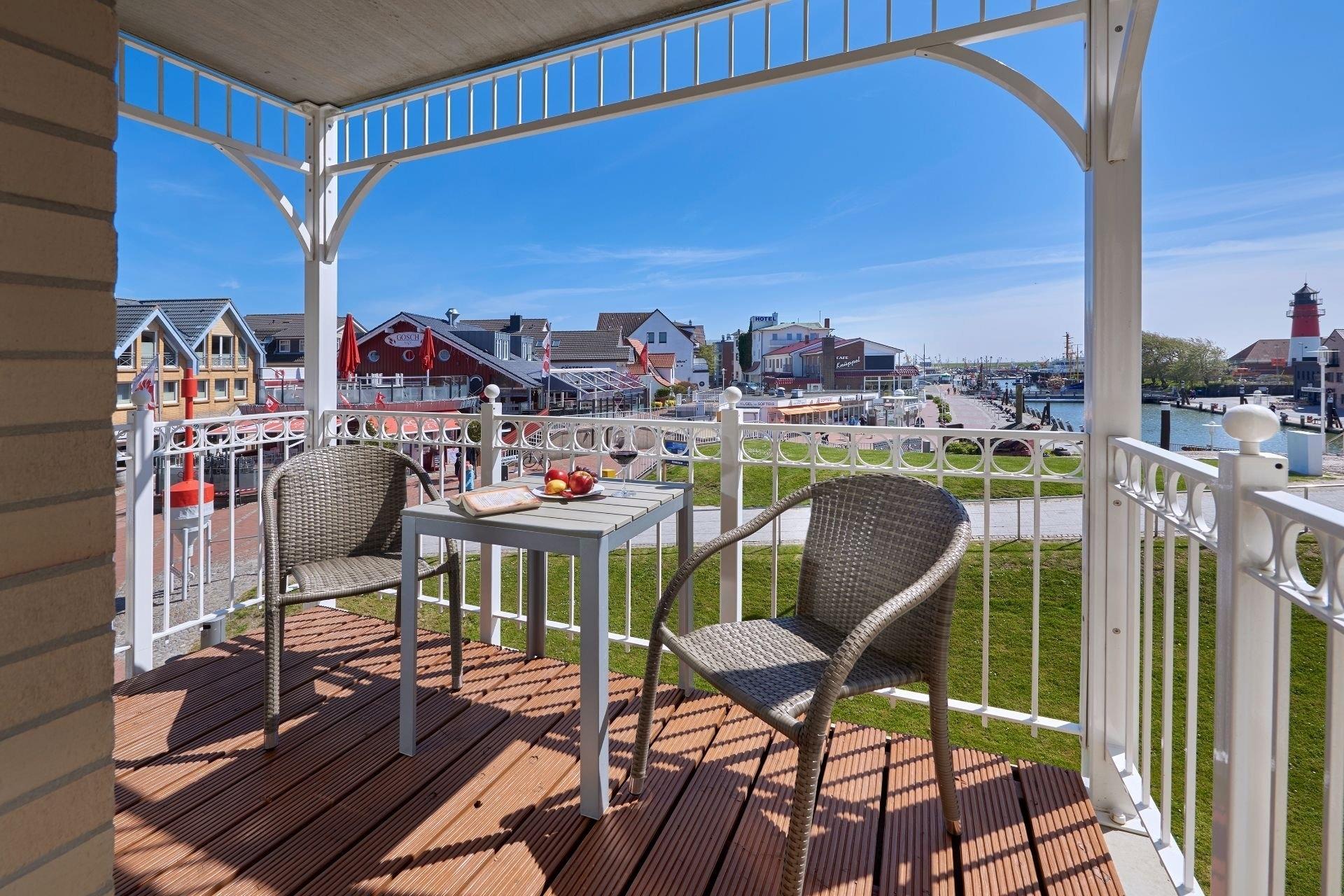 Die im zweiten Stock liegende Ferienwohnung ist ideal für zwei Personen. Mit großen Fenstern in Südausrichtung bieten wir unseren Gästen lichtdurchflutete Räume und einen schönen Ausblick auf den Museumshafen. Holzfußböden im großzügigen Wohn- und Esszimmer sowie im Schlafzimmer und eine hochwertige Schallisolierung sorgen für eine angenehme und erholsame Atmosphäre. Auf dem möblierten Balkon können Sie bei schönem Wetter bis zum frühen Abend die Sonne genießen. Sie werden sich zu jeder Jahreszeit und bei jedem Wetter bei uns wohl fühlen.