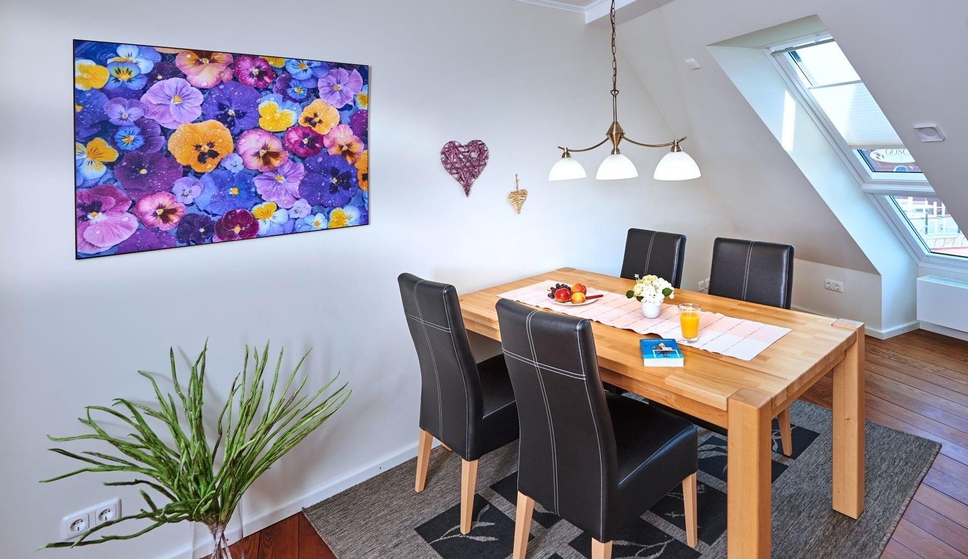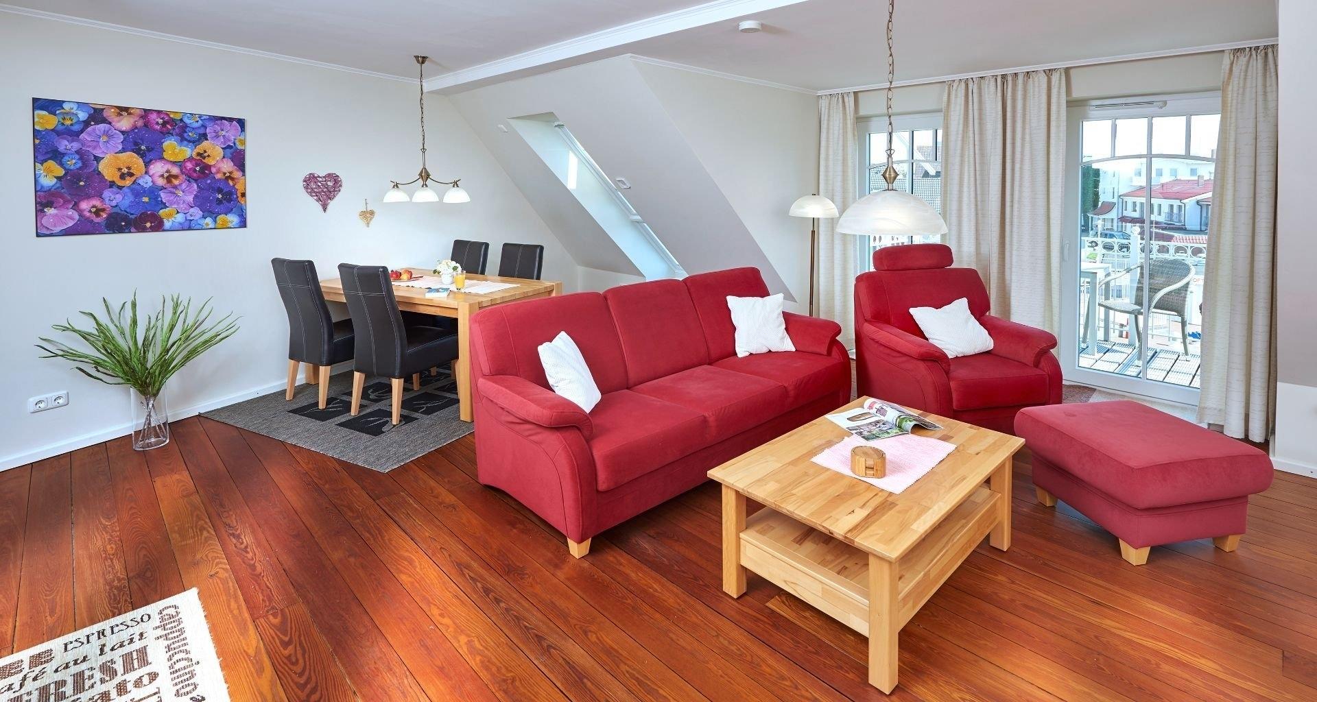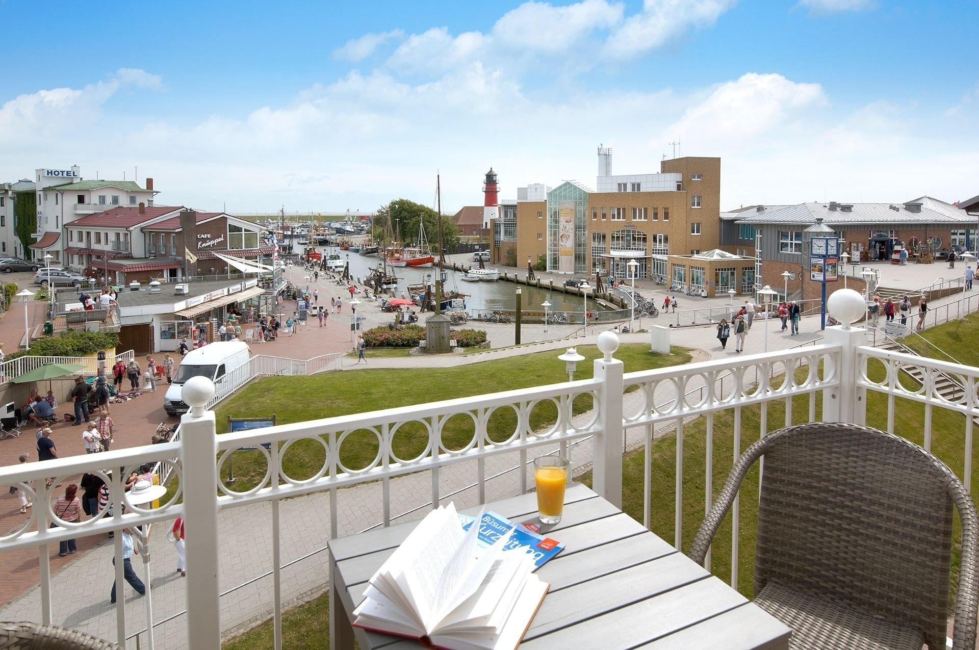 Die schöne Ferienwohnung im Dachgeschoss ist mit einem sehr großzügigen Wohn- und Essbereich ausgestattet. Mit großen Fenstern in Südausrichtung bieten wir unseren Gästen lichtdurchflutete Räume und einen schönen Ausblick auf den Museumshafen. Urige Holzdielen sowie eine hochwertige Schallisolierung bieten eine angenehme und erholsame Atmosphäre. Ganz besonderen Komfort bieten wir mit einer hochwertigen Ausstattung der Ferienwohnung und stufenfreien Zugängen, insbesondere mittels Aufzug und praktischer Walk-In-Dusche im Bad. Auf dem mit einer Markise ausgestatteten möblierten Balkon können Sie bei schönem Wetter bis zum frühen Abend die Sonne genießen und das bunte Treiben in der Fußgängerzone und um den Museumshafen beobachten. Sie werden sich zu jeder Jahreszeit und bei jedem Wetter bei uns wohl fühlen.