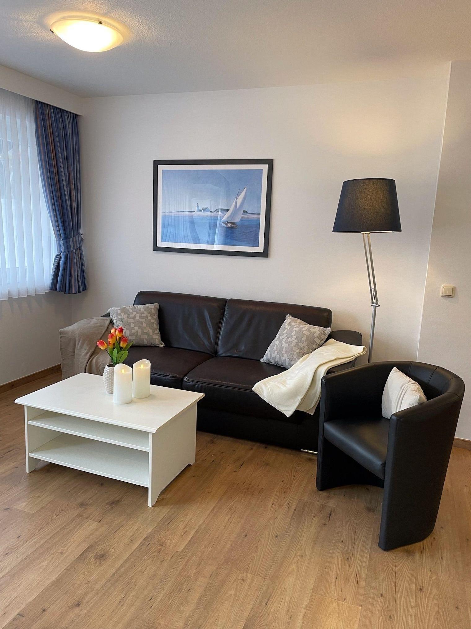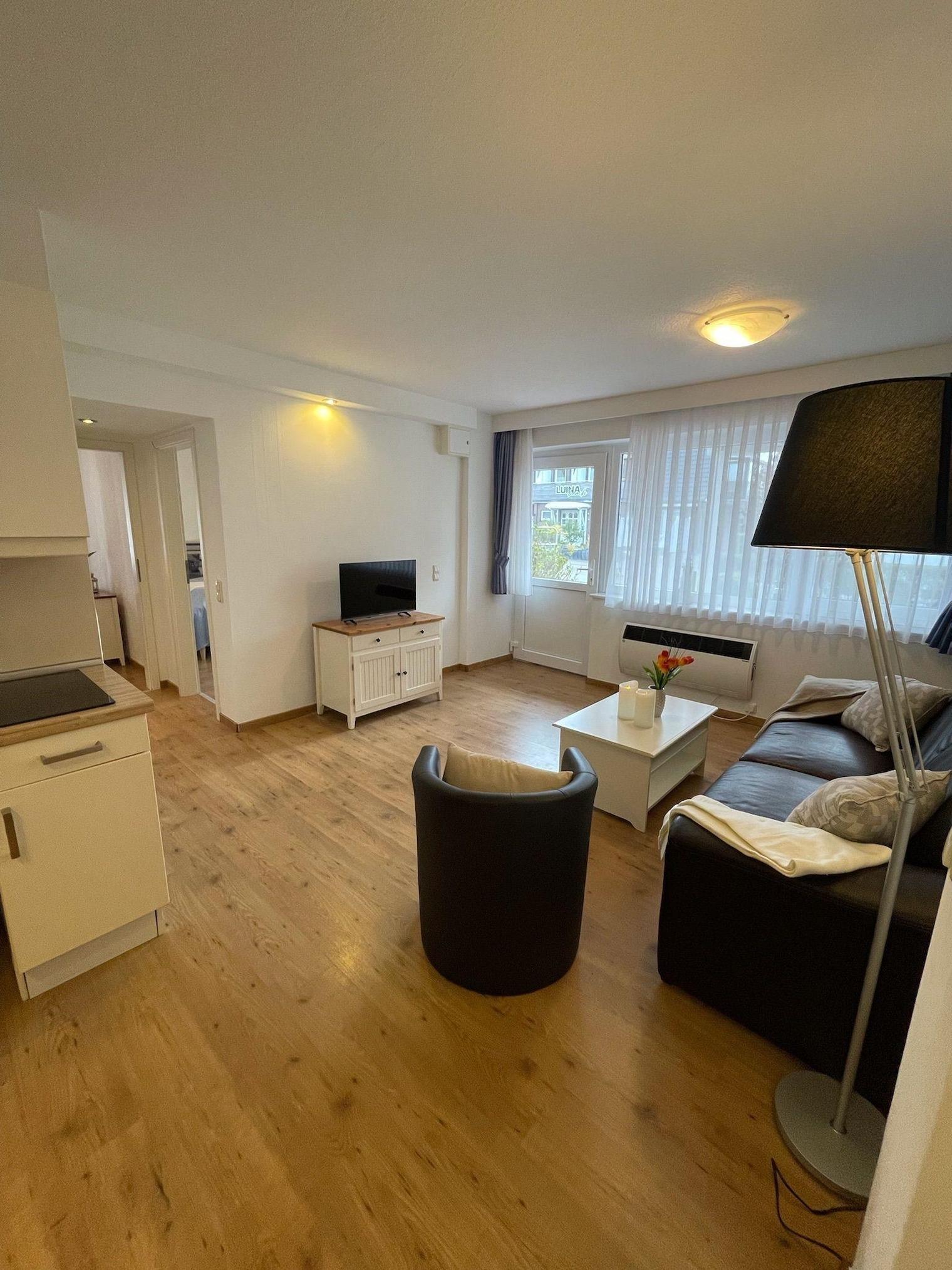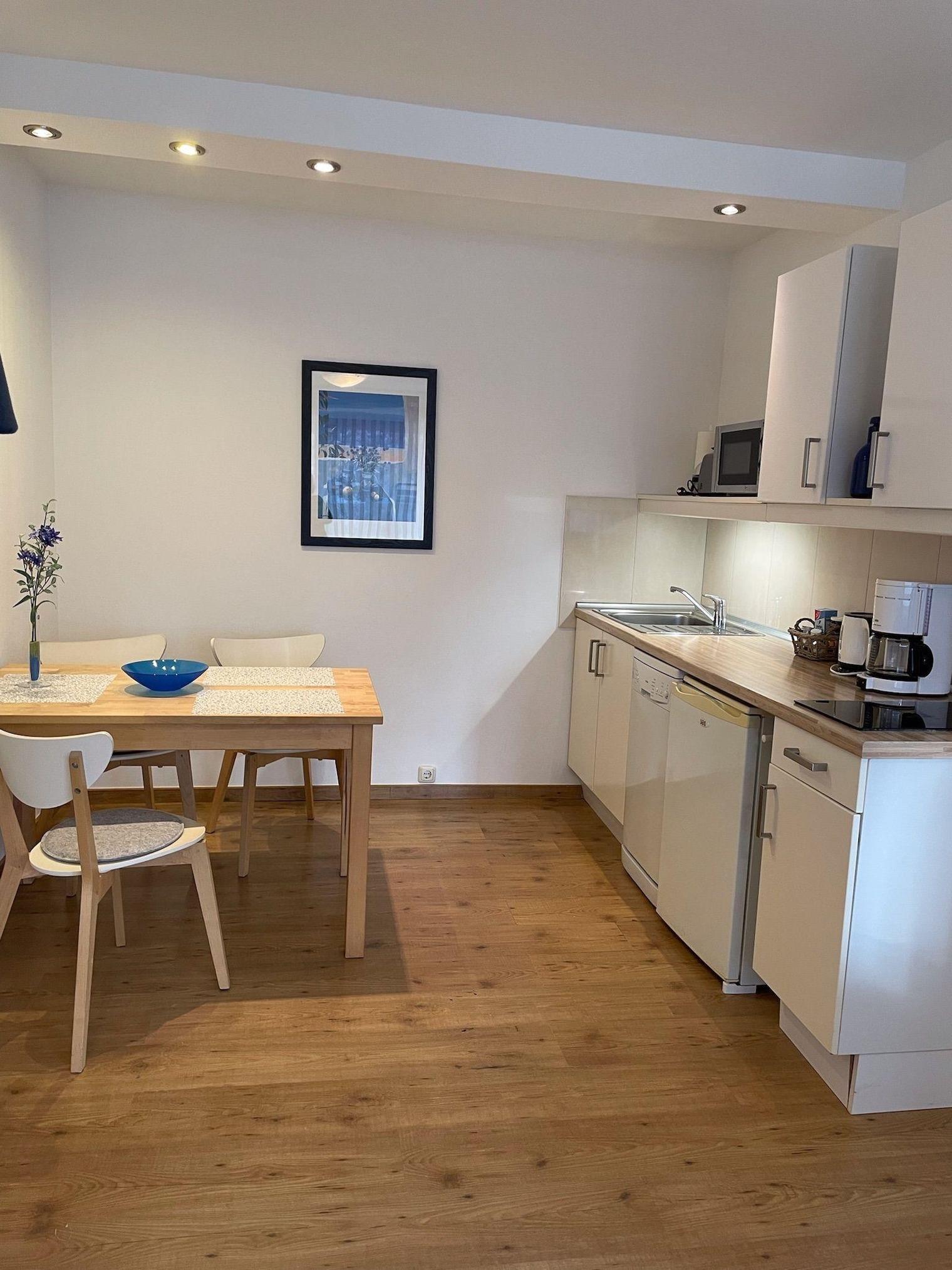 Der Feriengarten Büsum - B01 ist eine einladende Unterkunft mit einer Fläche von 55 m², die Platz für bis zu drei Erwachsene oder eine kleine Familie bietet. Der offene Wohnbereich verbindet Küche und Wohnzimmer. Die voll ausgestattete Küche verfügt über ein Cerankochfeld, Kühlschrank, Mikrowelle und Geschirrspüler sowie Kaffeemaschine und Toaster. Der gemütliche Essbereich mit Tisch lädt zum gemeinsamen Speisen ein. Zwei separate Schlafzimmer bieten erholsame Rückzugsmöglichkeiten, während das funktionale Badezimmer mit Dusche ausgestattet ist. Der Wohnbereich bietet mit zwei Sesseln und einem Sofa Raum für Entspannung und Unterhaltung. Die gesamte Unterkunft ist Nichtraucherbereich und allergikerfreundlich. Dienste wie ein Wäscheservice sorgen für zusätzlichen Komfort. Die familienfreundliche Atmosphäre und die Versorgung mit notwendigen Annehmlichkeiten machen den Aufenthalt angenehm und entspannt.