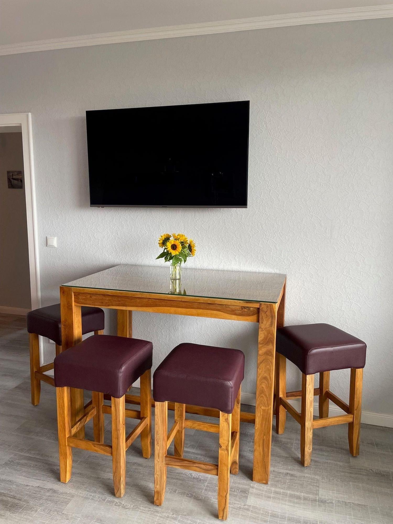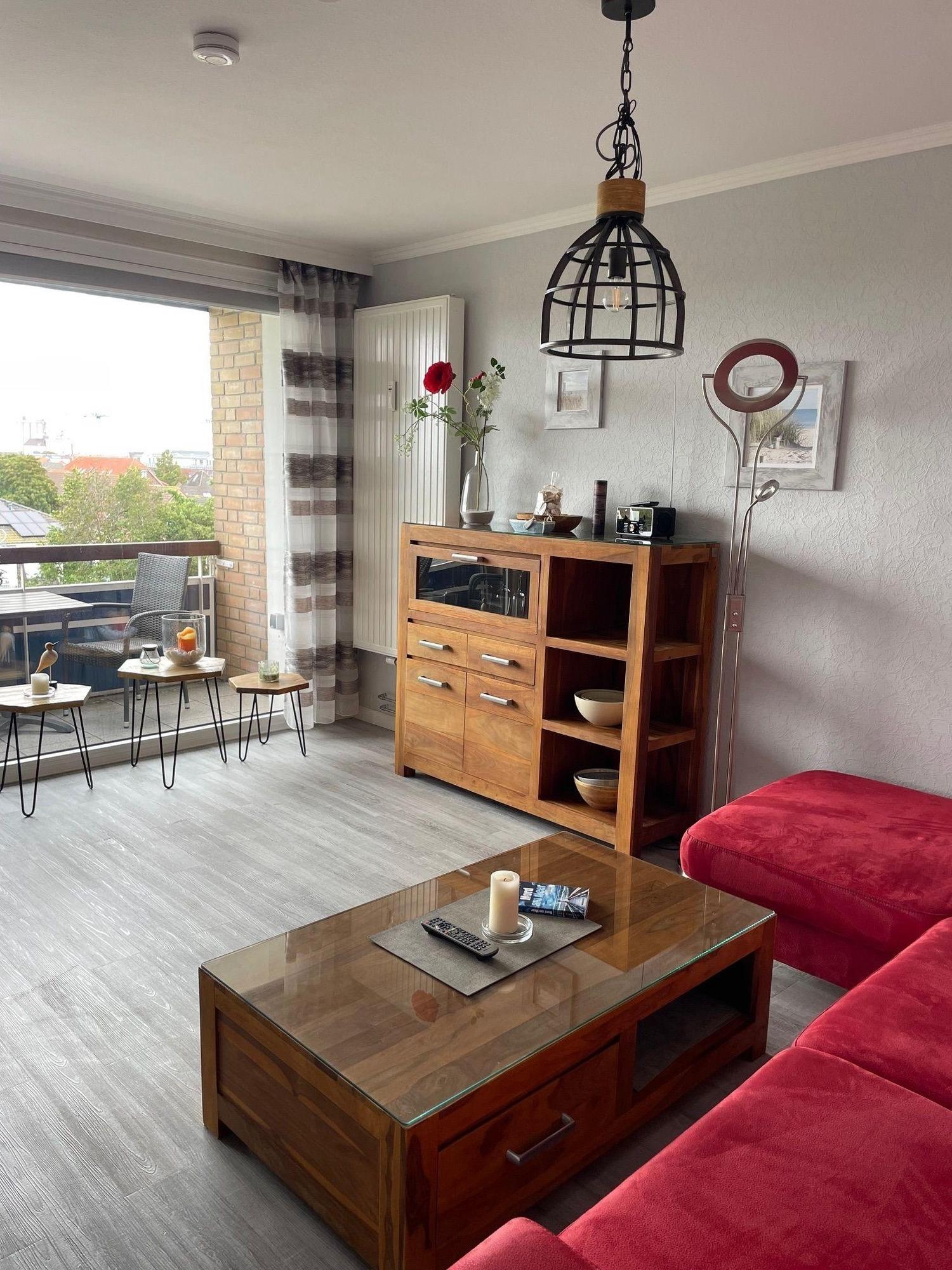 Im hellen und geräumigen Wohnzimmer finden Sie ein Ecksofa mit Schlaffunktion für 2 Personen, TV, einen hohen Esstisch mit 4 Barhockern und Ausblick über die Dächer von Büsum, sowie den Zugang zum Balkon mit seitlichem Meerblick.