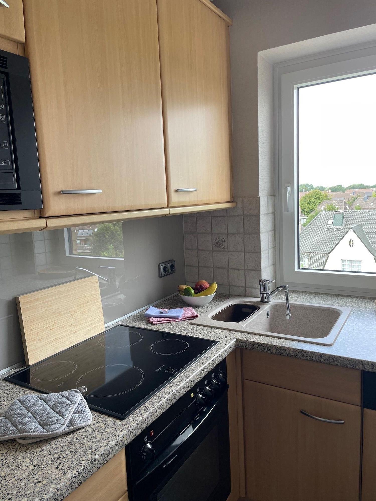 Die Küche ist vollständig mit Ceranherd, Backofen, Mikrowelle, Geschirrspüler, Kaffeemaschine und Wasserkocher ausgestattet. Ebenfalls finden Sie hier einen Wäschetrockner.