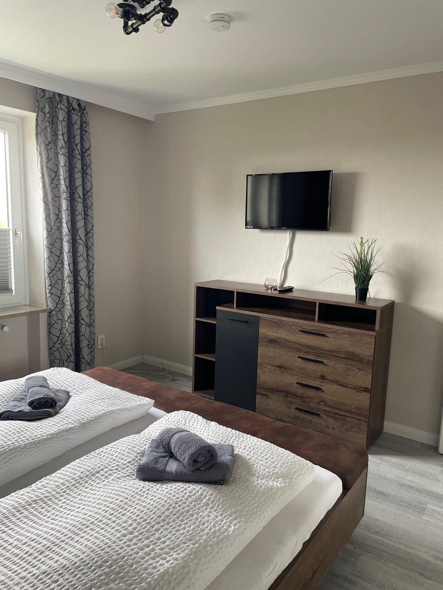 Das Schlafzimmer verfügt über ein Doppelbett, TV und ausreichend Platz, um ein zusätzliches Kindereisebett (kostenfrei zubuchbar) aufzustellen.