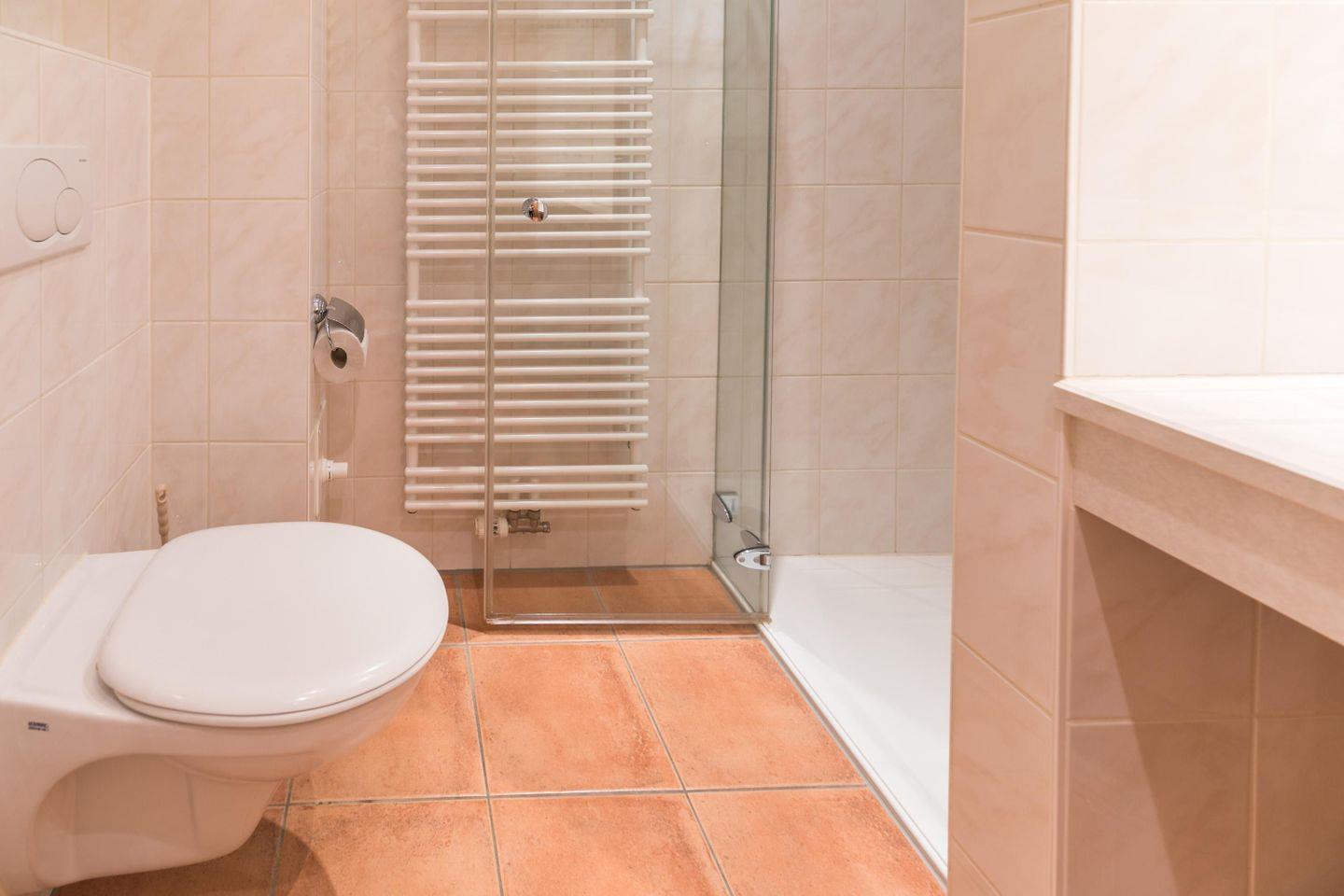 Dusche ebenerdig, WC, Waschbecken, Handtuchwärmer, Föhn, Abluft, Spiegel, Hocker