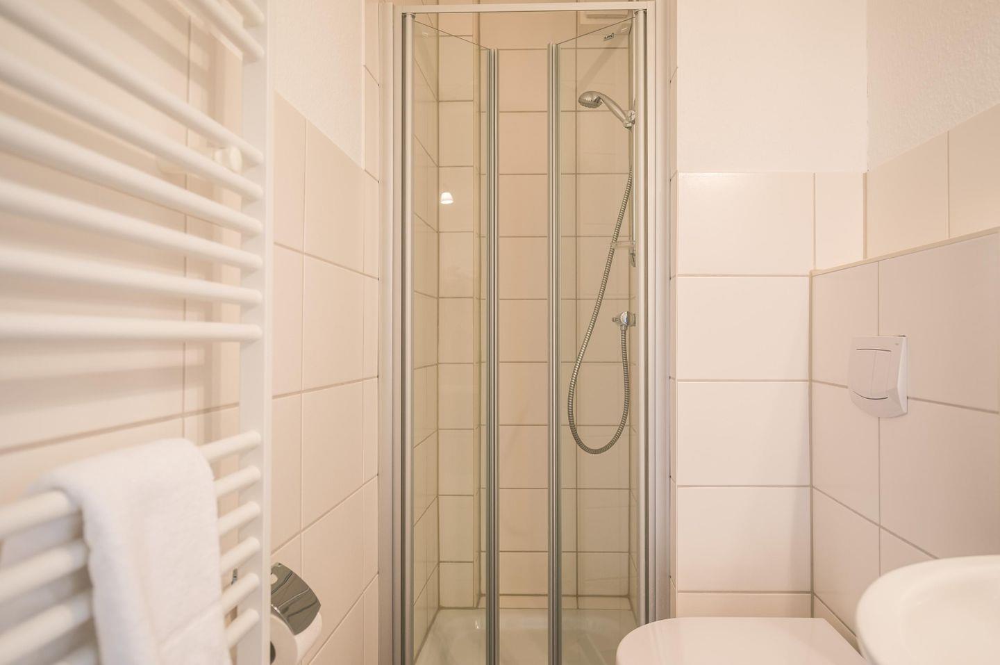 Dusche (niedriger Einstieg), WC, Waschbecken, Handtuchwärmer, Fön, Lüftung