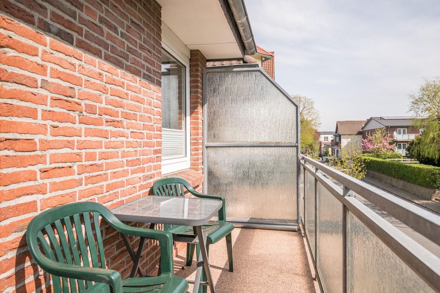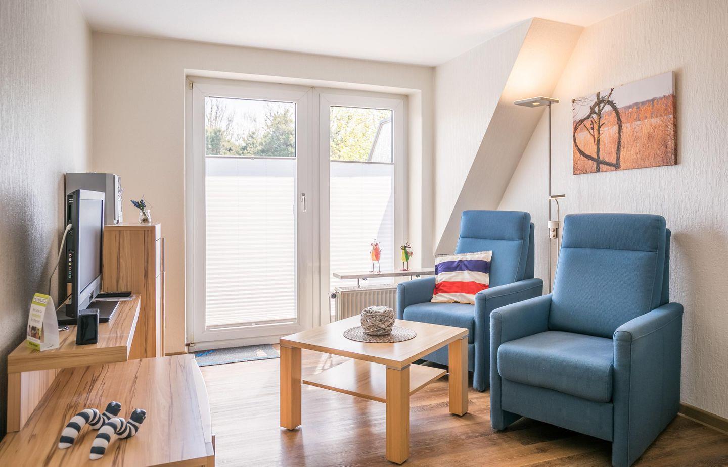 2 Sessel, Wohnzimmerschrank, Esstisch mit 2 Stühlen, Flachbild Sat-TV, Balkon, Zugang zum Balkon, CD Player