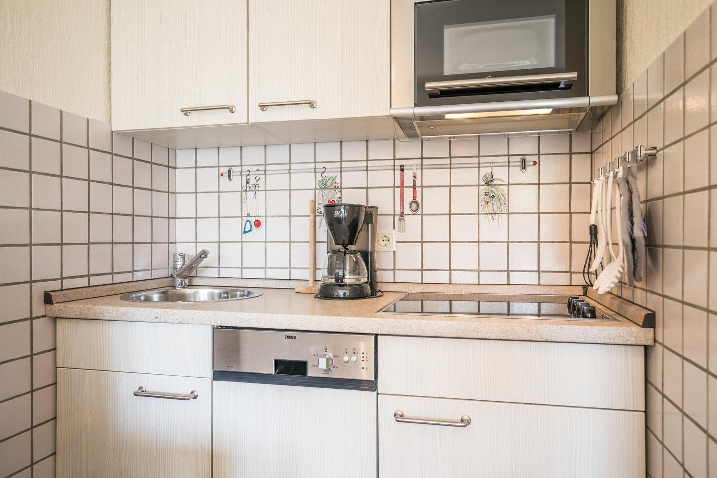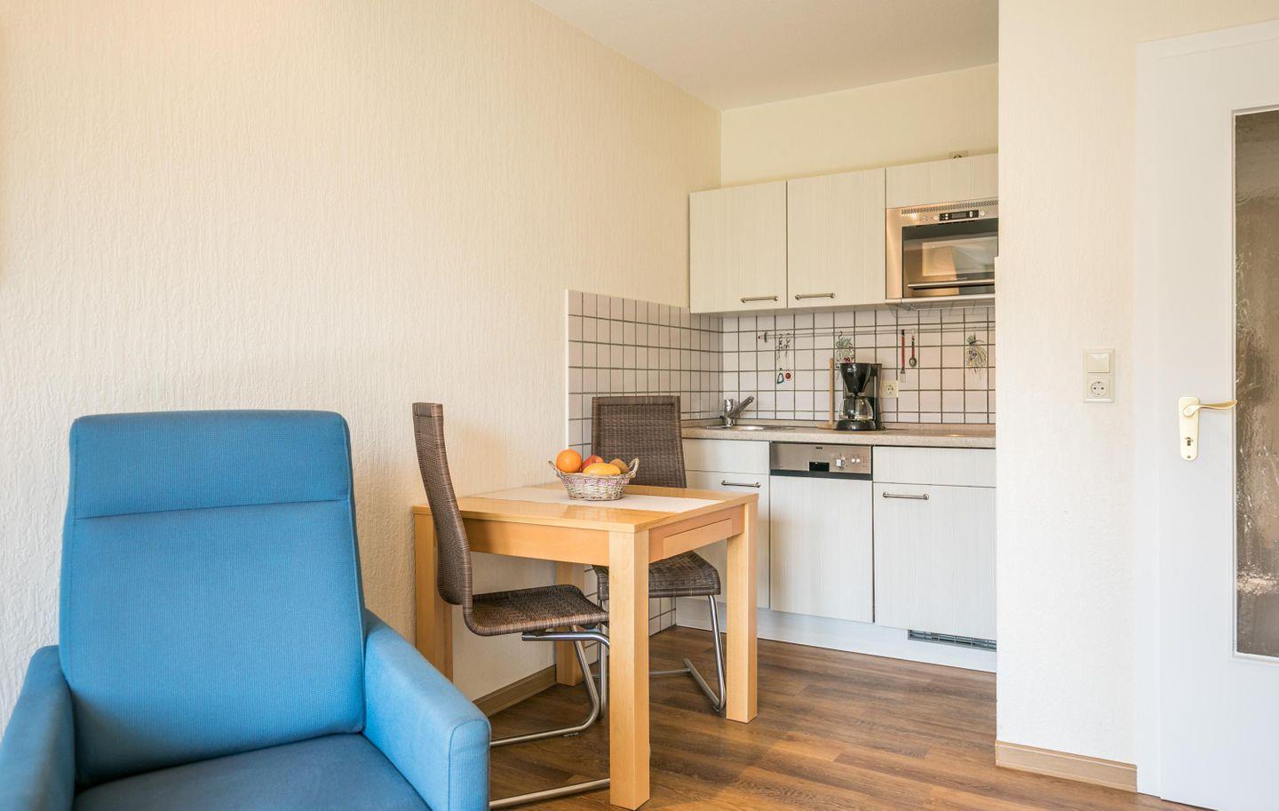 Im ersten Obergeschoss haben in einem Schlafzimmer bis zu 2 Personen Platz. Die Küche befindet sich in einer Nische vom Wohnraum abgängig.