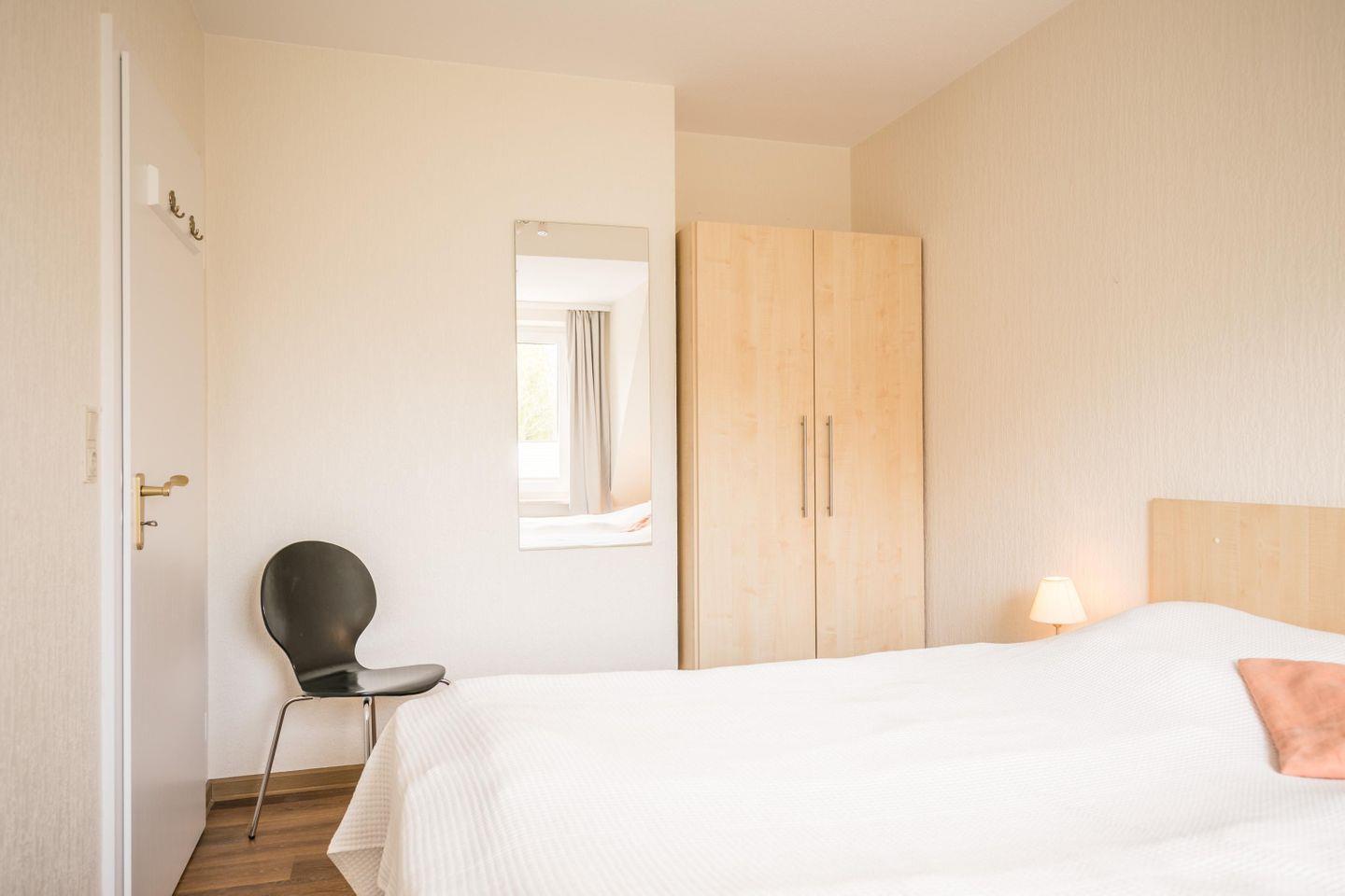Doppelbett (2 getrennte Matratzen á 200cm x 80cm x 60 cm), Kleiderschrank (2 türig.), Nachtkonsolen, Ganzkörperspiegel, Stuhl, Fenster Plissee, Verdunklungsvorhang