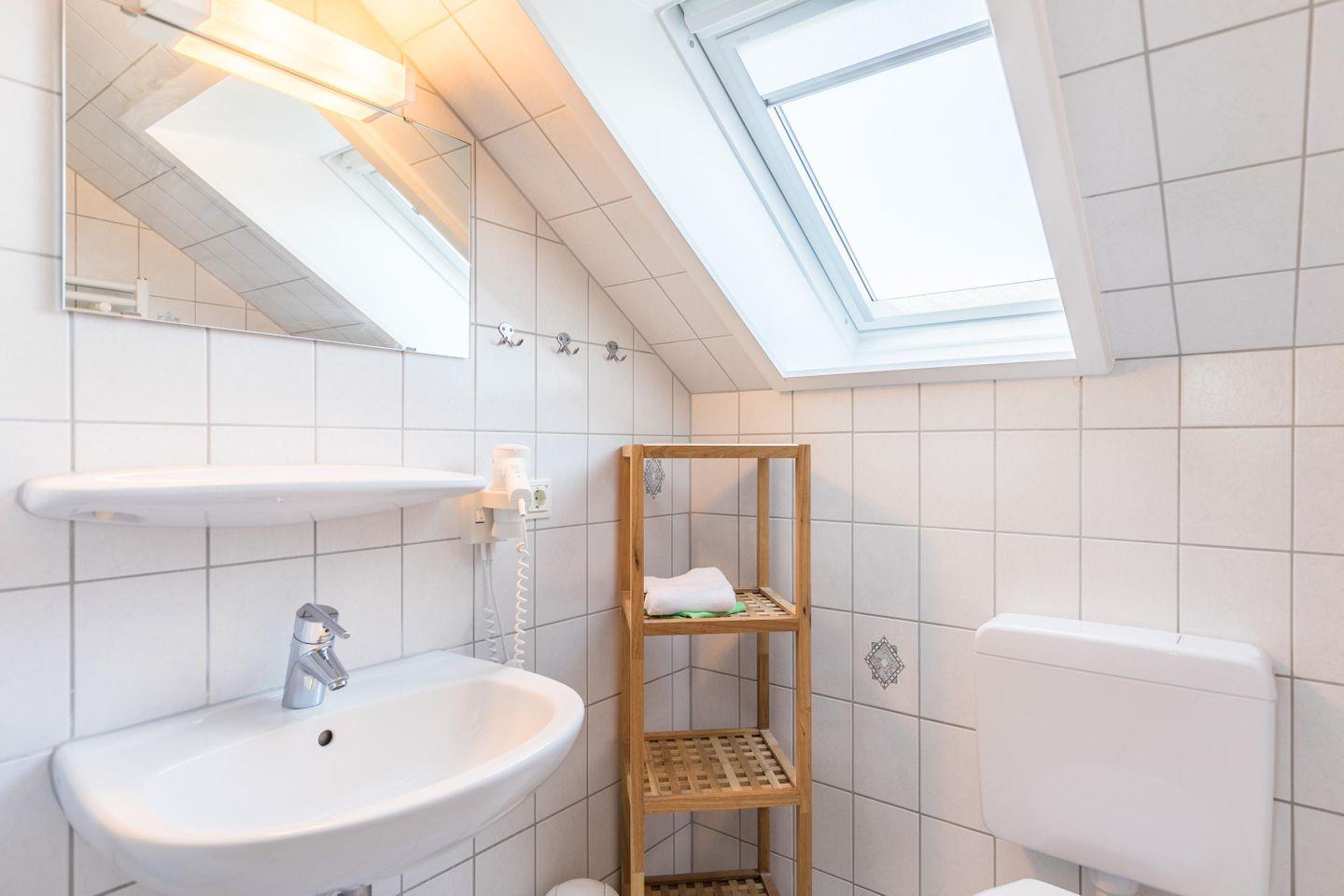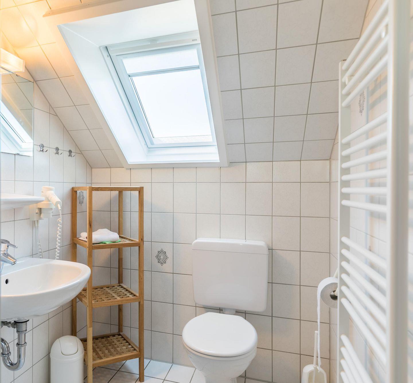 Dusche mit Duschwanne, WC, Waschbecken, Handtuchheizung, Fön, Jalousie