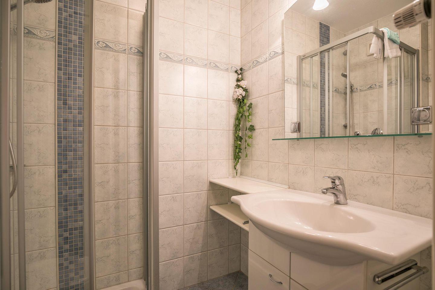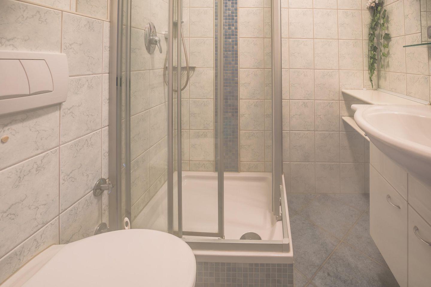 Duschbad, WC, Waschtisch mit Ablage, Spiegel, Abluft
