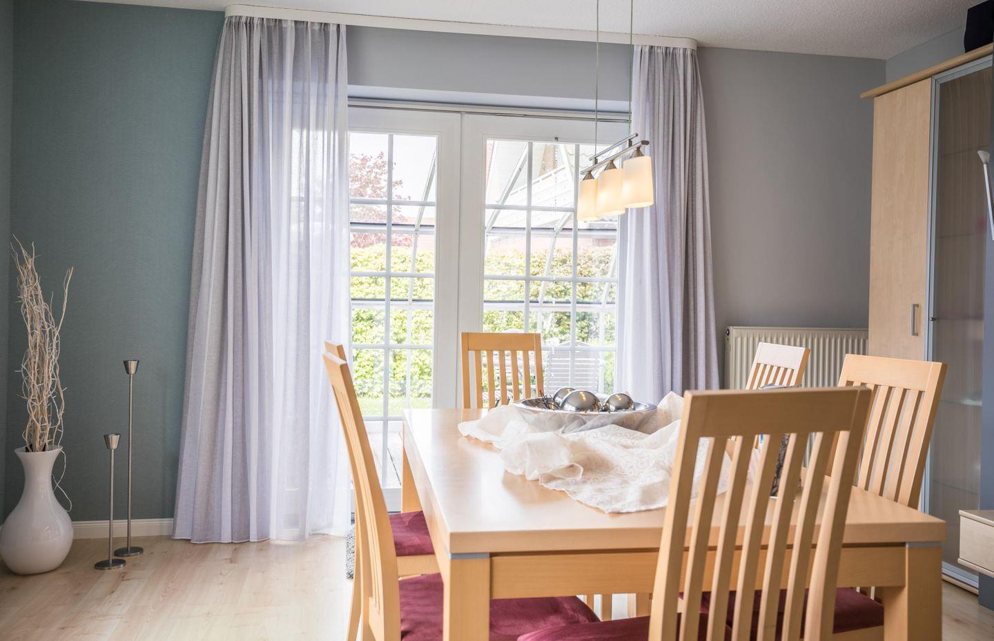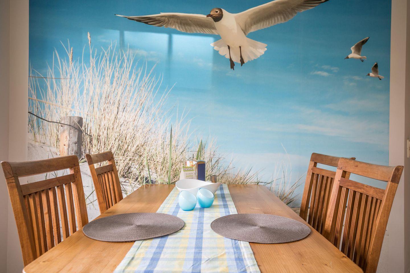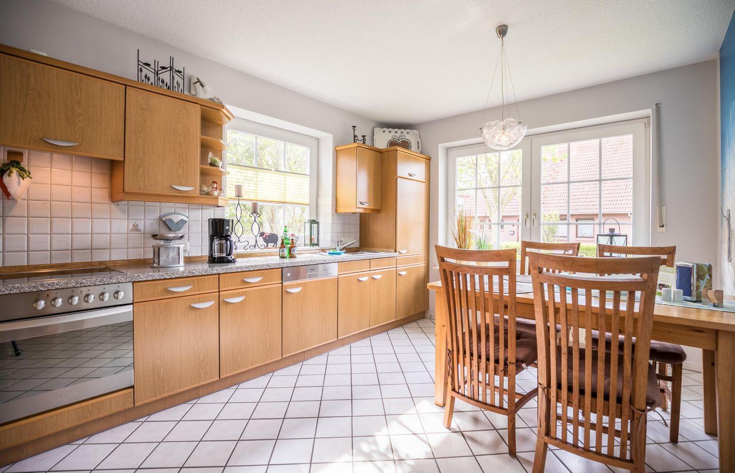 In der separaten Küche kann ausgiebig gekocht und gegessen werden. Ebenso steht im Wohnzimmer ein großer Esstisch bereit, um gemeinsame Mahlzeiten einzunehmen, zu spielen oder einfach nur um gemütlich zusammen zu sitzen.