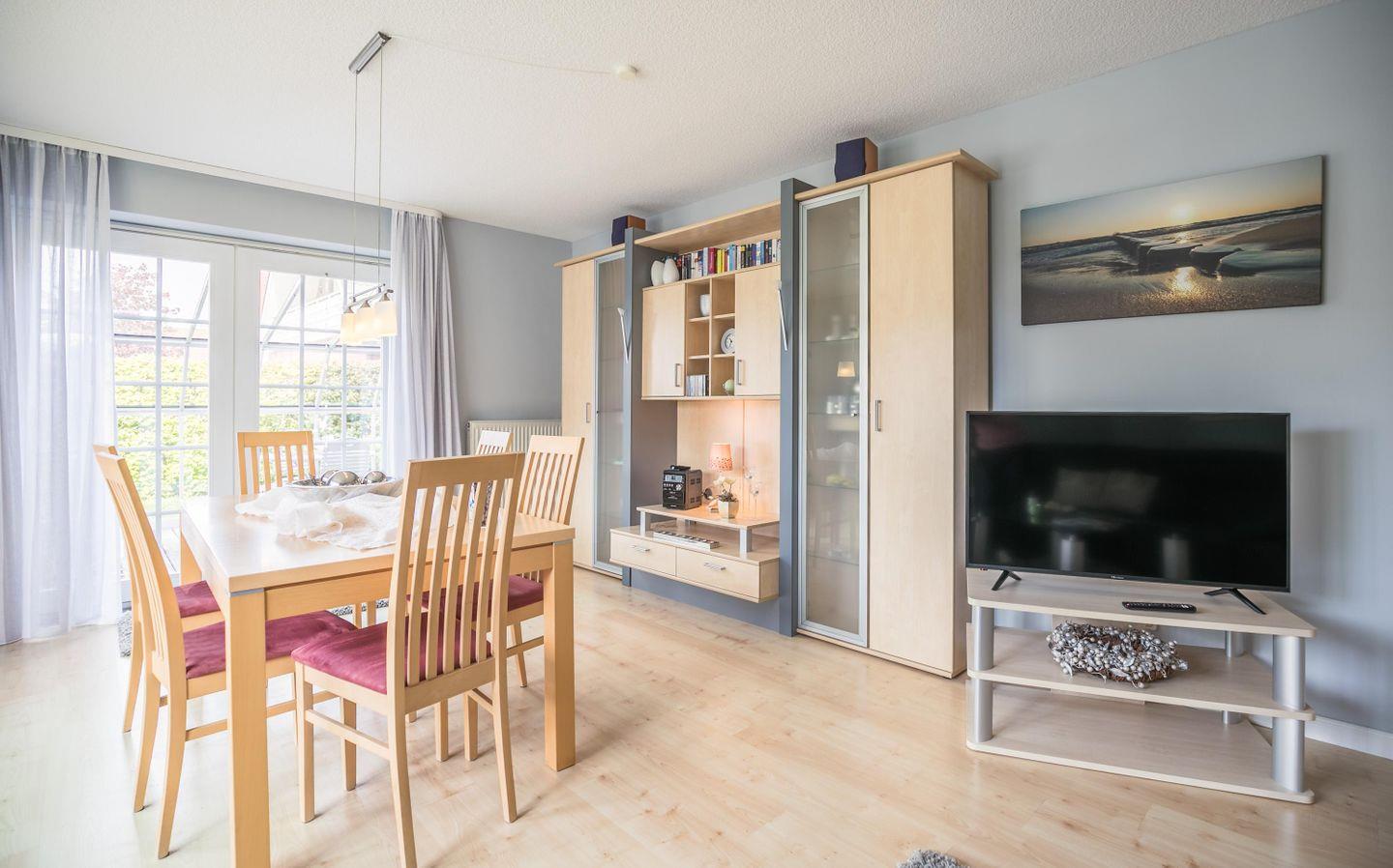 Couchgarnitur, Esstisch, 6 Stühle, Flachbild-TV, Stereo-Anlage mit CD-Player, Bücher, Rollladen, Wintergarten, Strandkorb