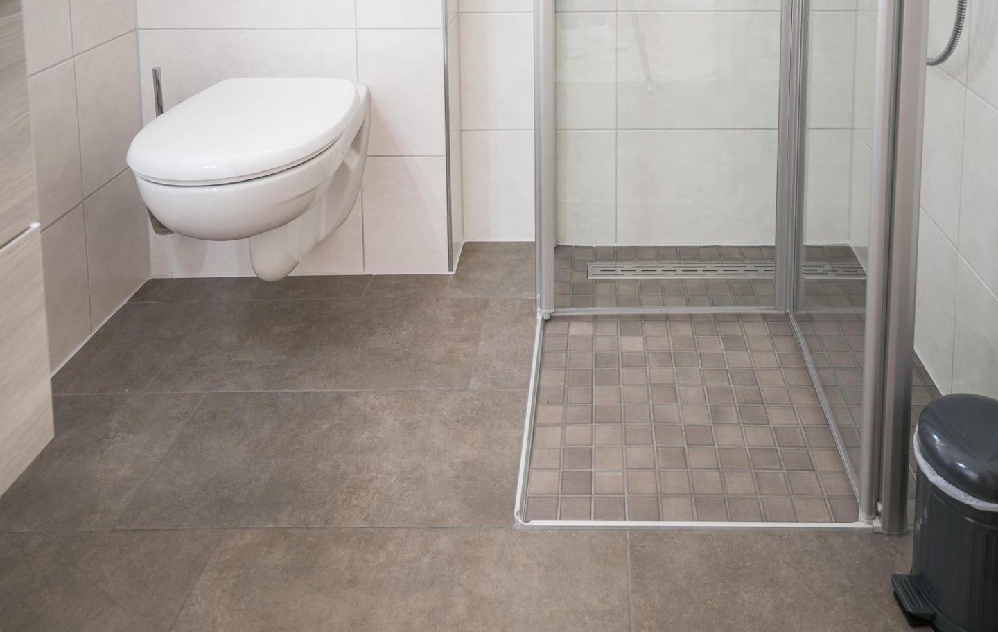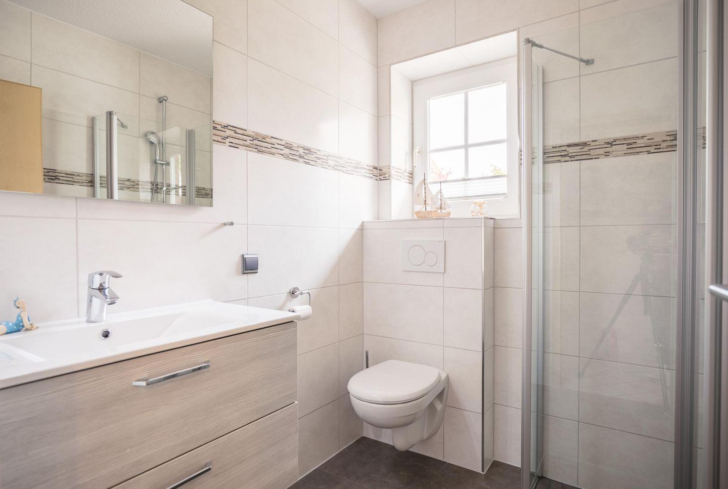 Duschbad, WC , Handtuchwärmer, Ablageflächen, Fön, Fenster, bodentiefe Dusche