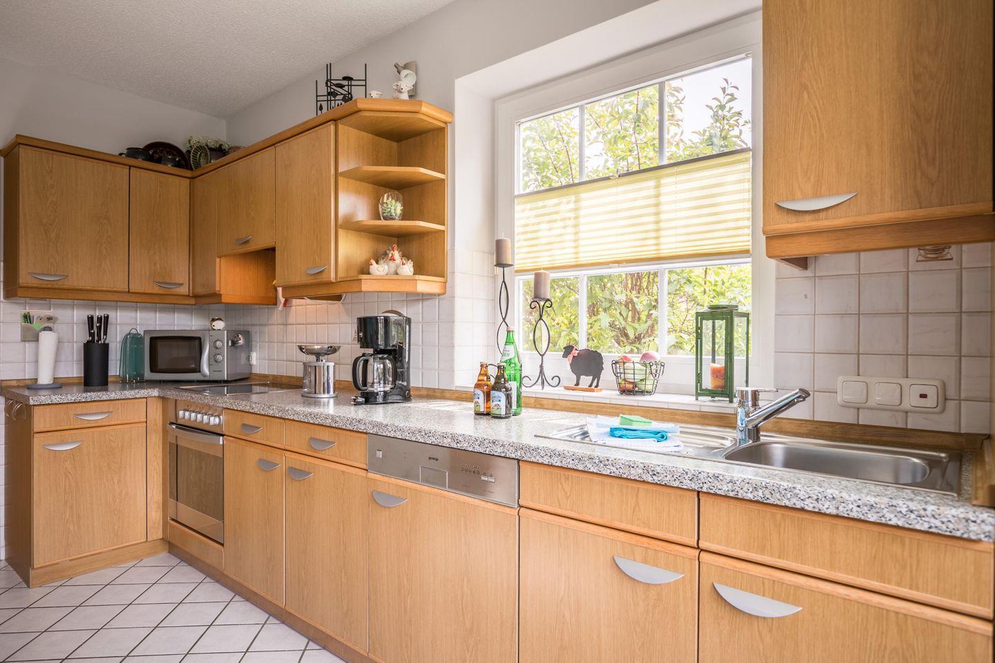 Einbauküche, Ceran-Kochfeld, Geschirrspüler, Abluft, Backofen, Mikrowelle, Kühlschrank mit Gefrierfach, Wasserkocher, Toaster, Kaffeemaschine, Eierkocher, Rollladen