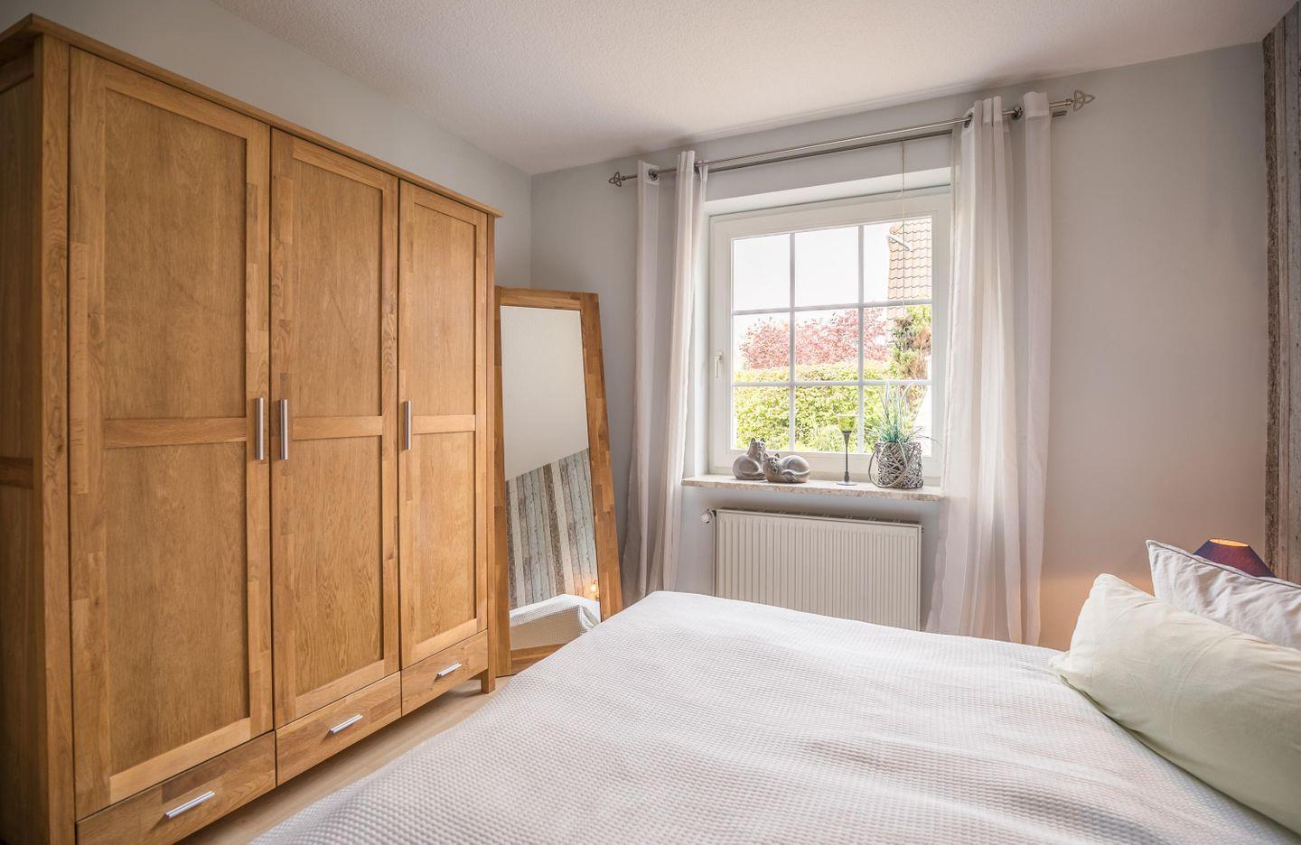 Doppelbett, Kleiderschrank, Spiegel, Wecker, Nachtkonsolen, Rollladen