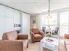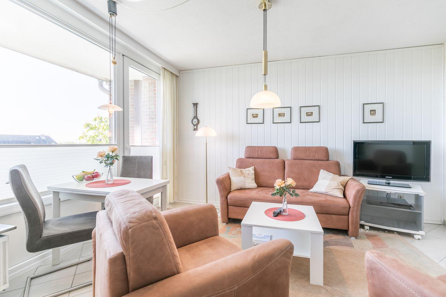 Couchgarnitur, Essecke, 2 moderne Schrankbetten, Flachbild-TV mit Kabel-TV und DVD-Player, Stereo- Radio mit CD-Player, Südbalkon