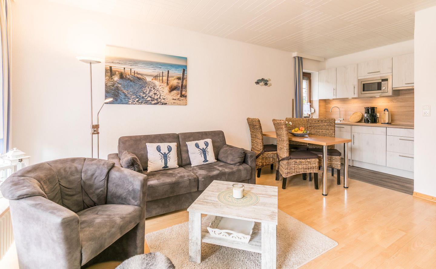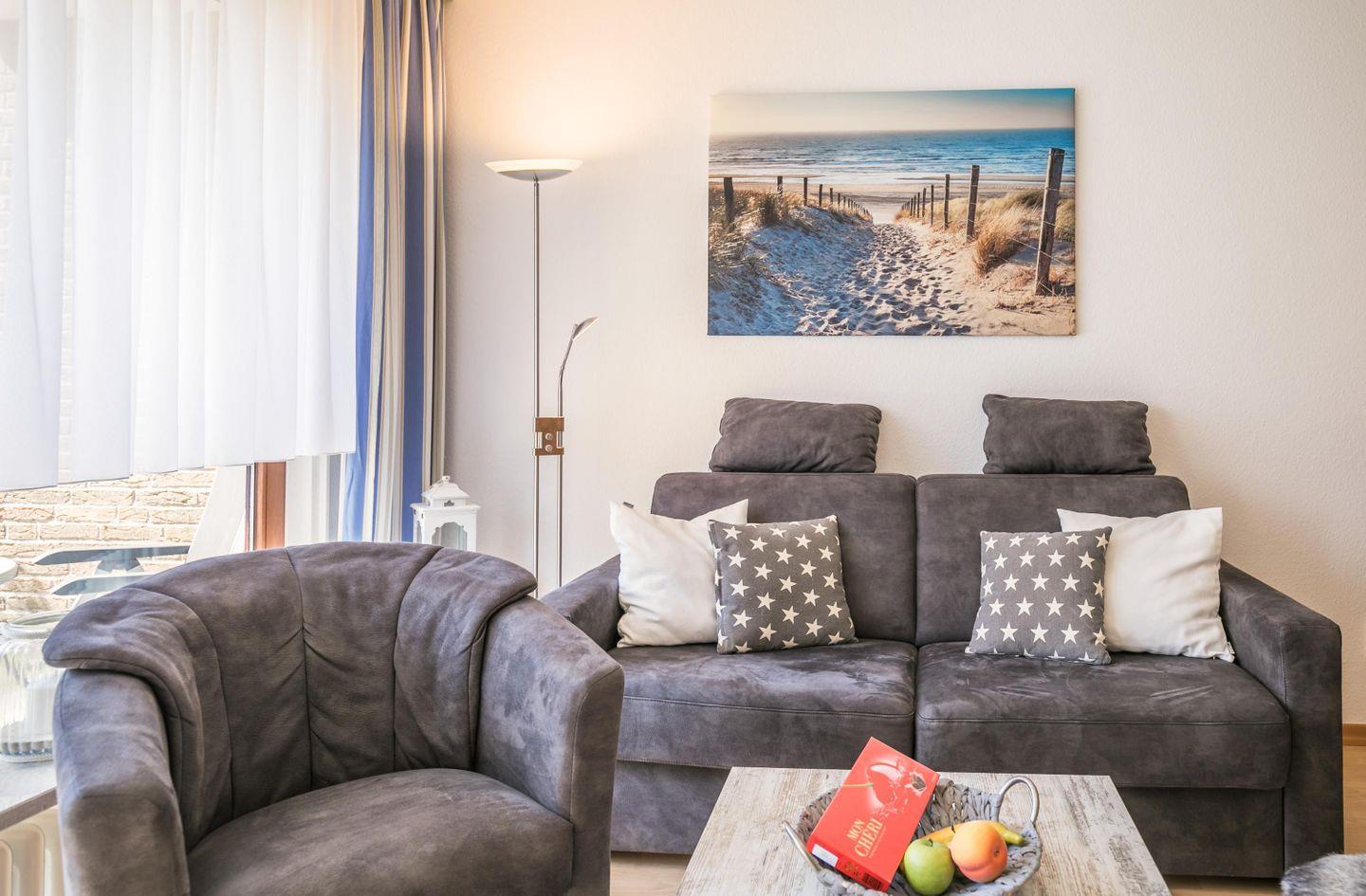 Helle und moderne Farben sorgen für ein behagliches Wohnklima! Das neue Komfort-Schlafsofa ermöglicht es Ihnen diese Ferienwohnung ab sofort mit bis zu 3 Personen zu buchen. Ein hell gestaltetes Bad mit Fenster ist ebenso wie ein gemütliches Doppelbett im Schlafzimmer vorhanden. Um vom Parkplatz zum Haus Schloß am Meer zu gelangen müssen Sie ein paar Stufen steigen.