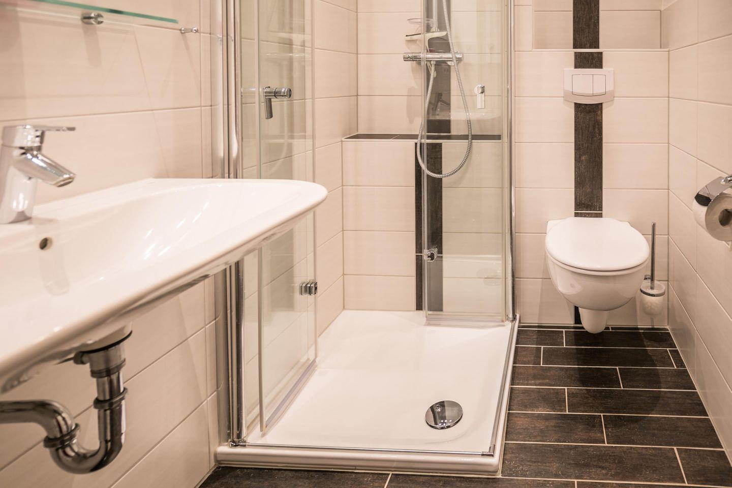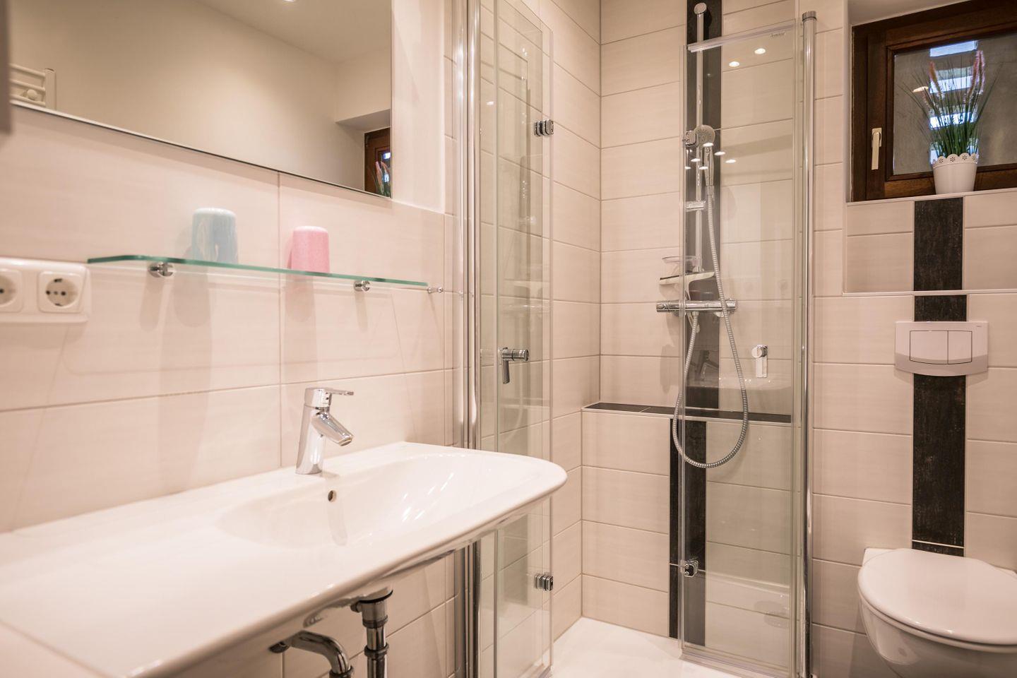 Dusche, WC, Spiegel, Handtuchtrockner, Fenster, Föhn