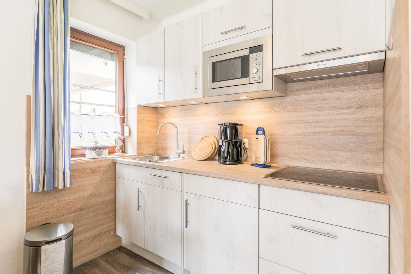 offene Küchenzeile, 4-Platten-Herd, Umluft, Mikrowelle mit Backfunktion, Kühlschrank mit Gefrierfach, Geschirrspüler Kaffeemaschine, Wasserkocher, Toaster, Eierkocher