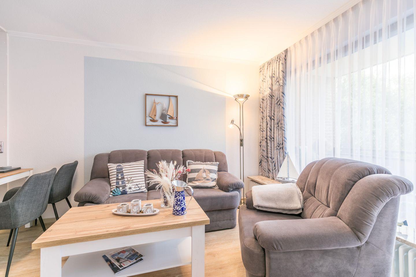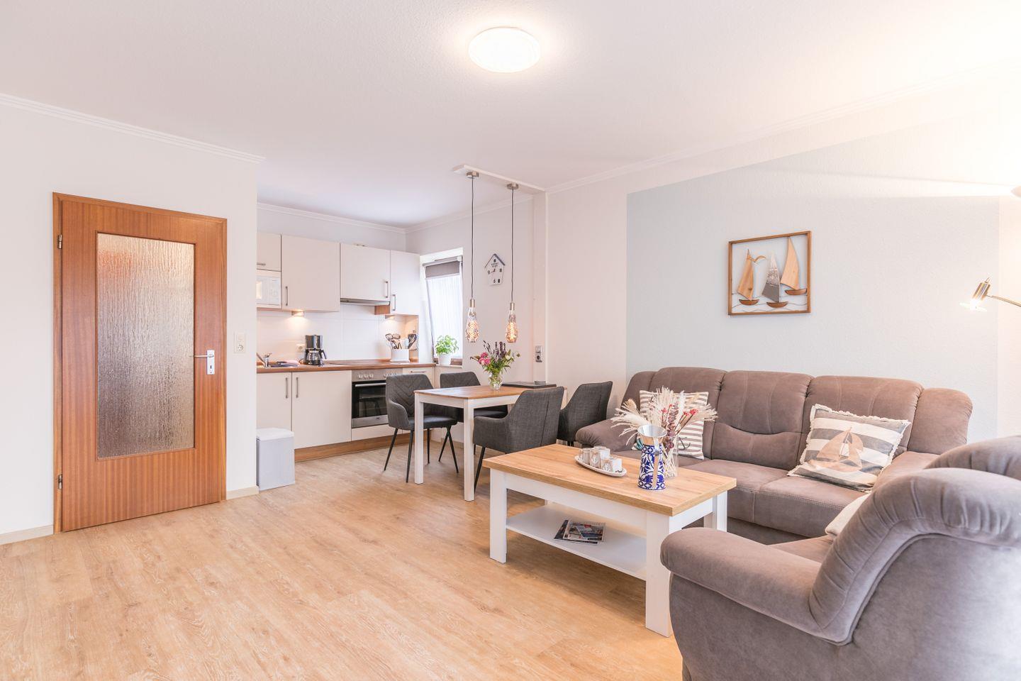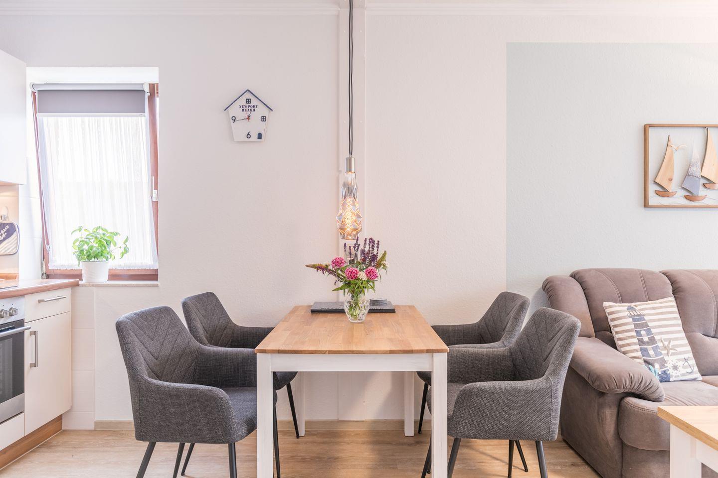 Die Küchenzeile ist für den Urlaub bestens ausgestattet und ermöglicht kleine Mahlzeiten zwischendurch. Dank der Lage wohnen Sie ruhig und bist gleichzeitig in wenigen Gehminuten am Deich, im Ortskern oder am Hafen – ideal für Spaziergänge, Restaurantbesuche und den morgendlichen Bäcker-Stopp.