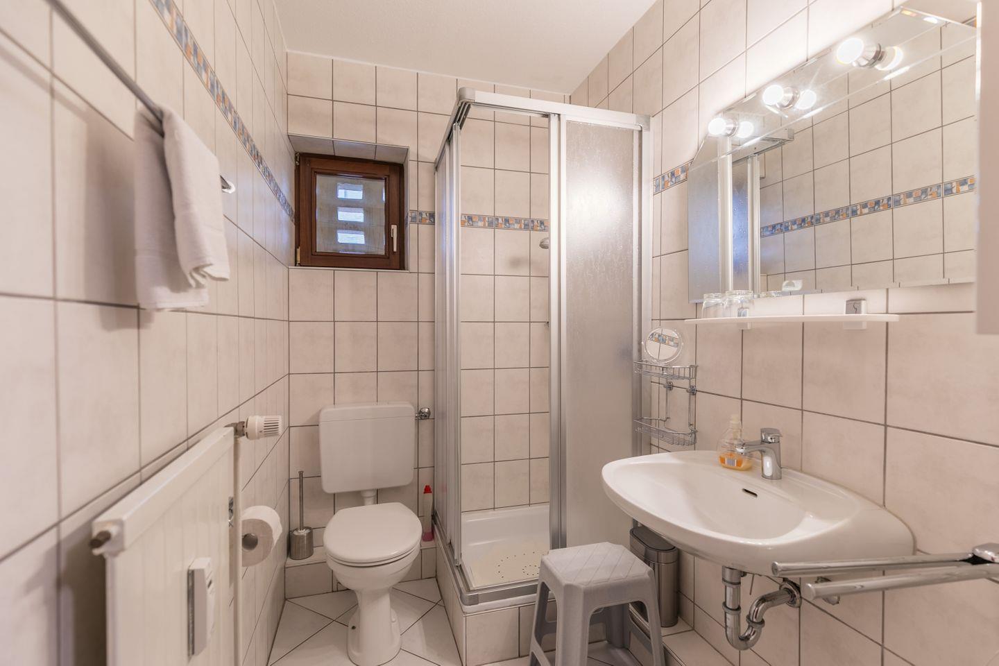 Dusche, WC, Spiegel mit Lampen, Waschbecken, Föhn; Sitzhocker