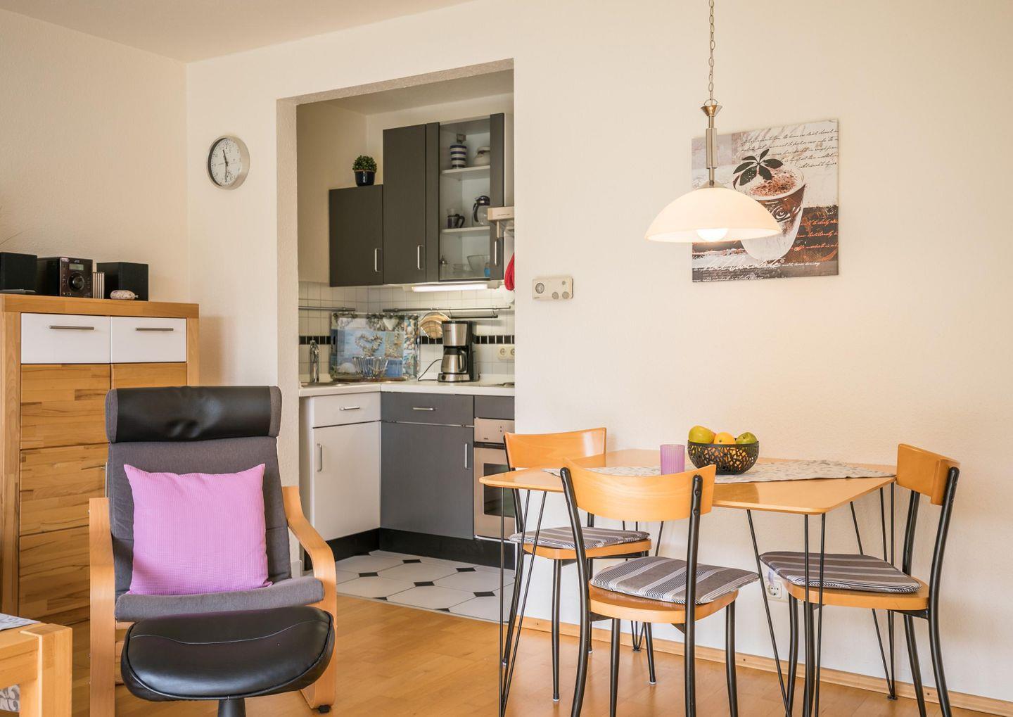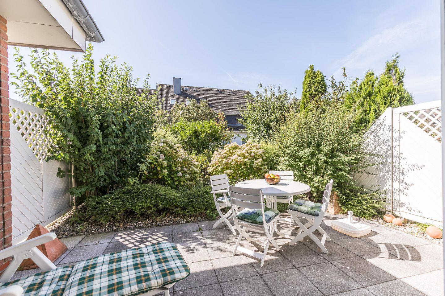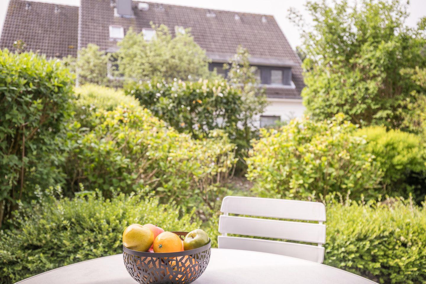 W-LAN, ruhige Südterrasse, Gartenmöbel, Sonnenschirm, 1 Gartenliege, Abstellraum, keine Haustiere, Nichtraucherwohnung, Wäsche optional dazu buchbar, kostenfreier Privatparkplatz
