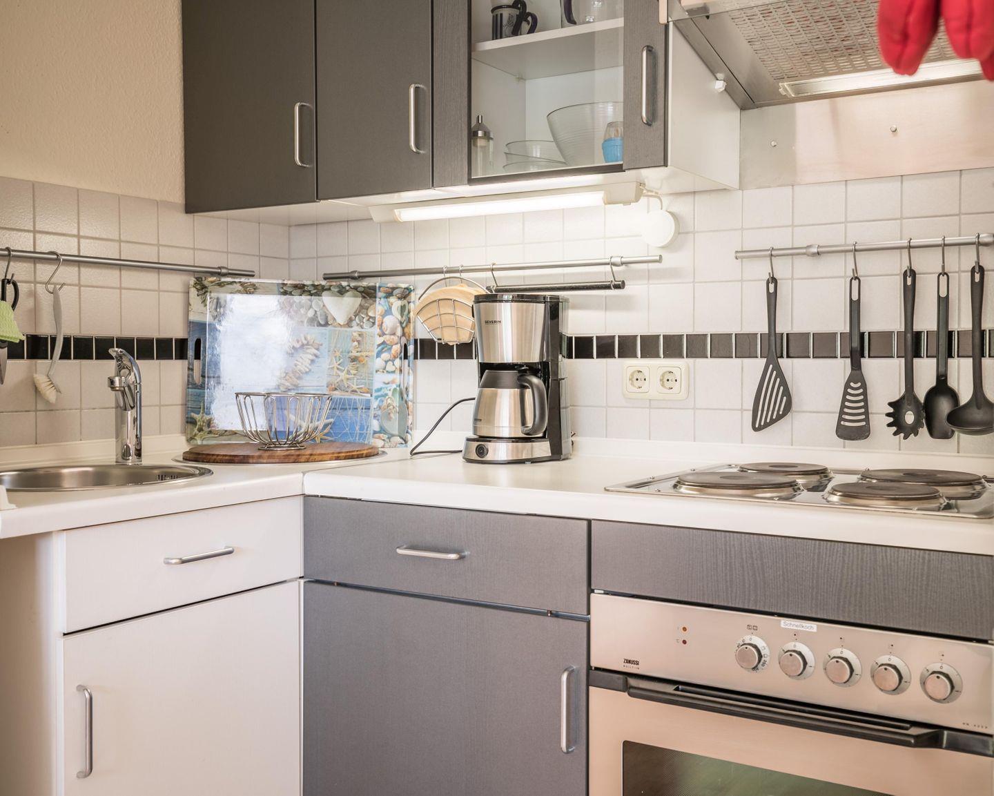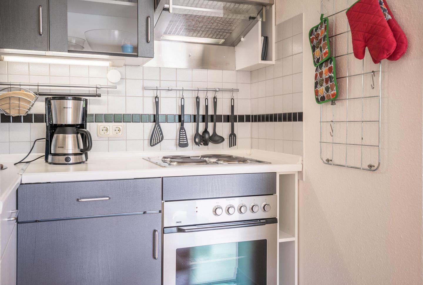Herd mit Backofen, Cerankochfeld, Kühlschrank mit Gefrierfach, Wasserkocher, Kaffeemaschine, Handmixer, Toaster, Eierkocher
